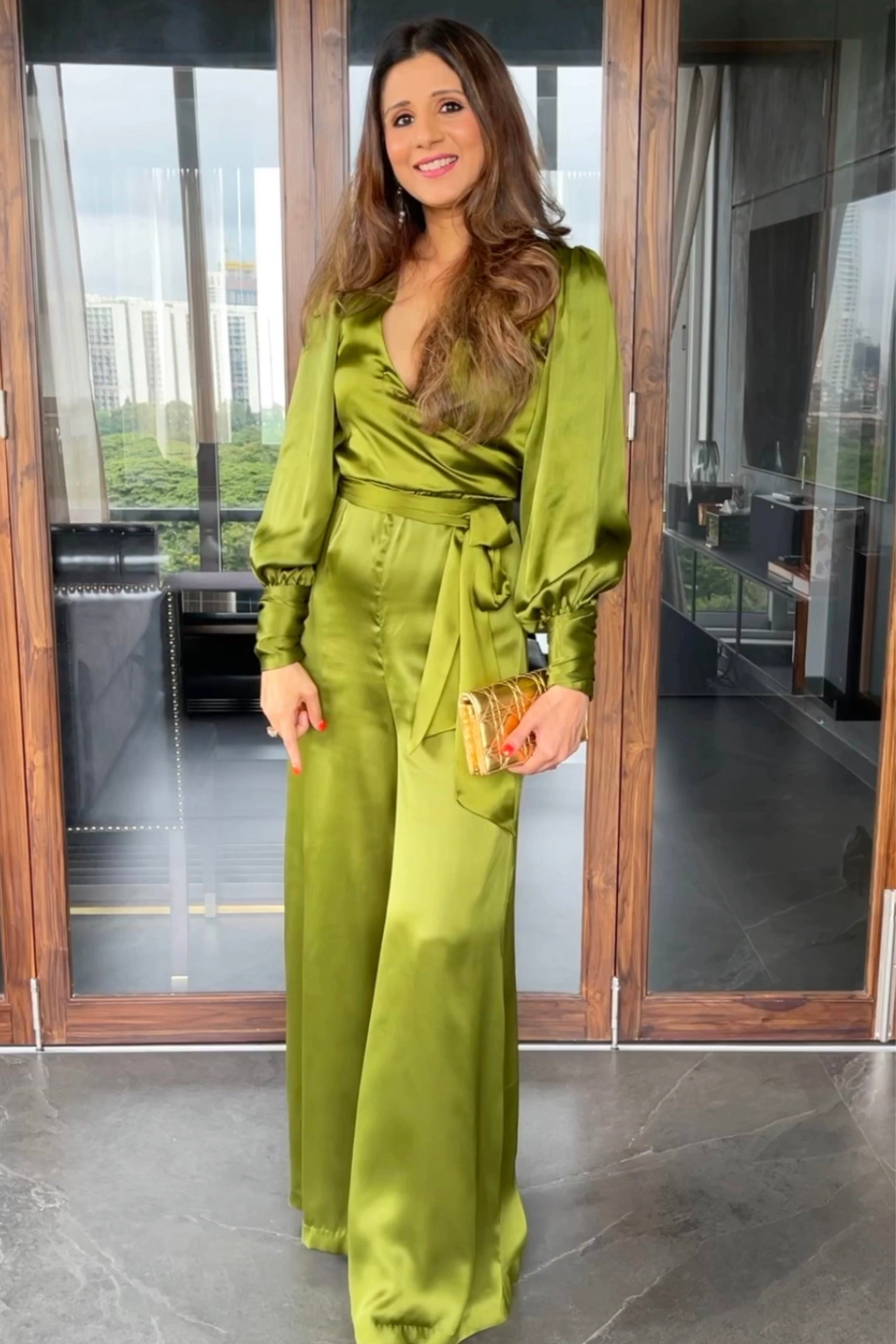 - Style: Long-Sleeve Satin Wrap Jumpsuit