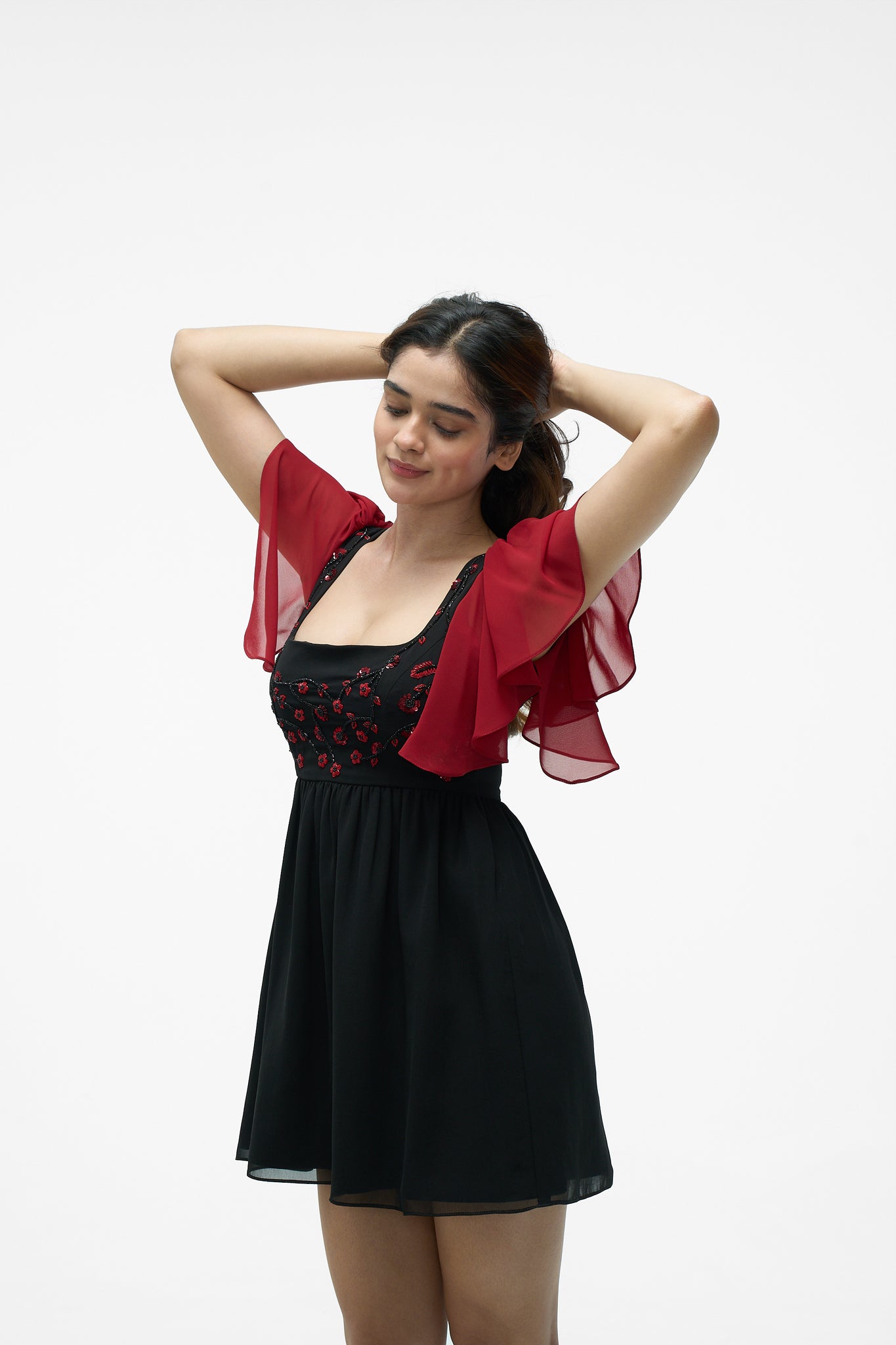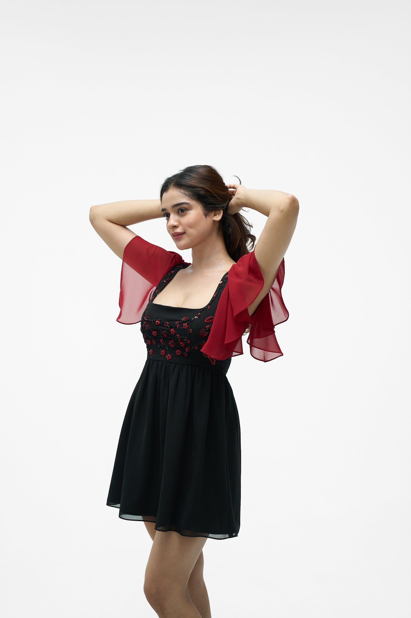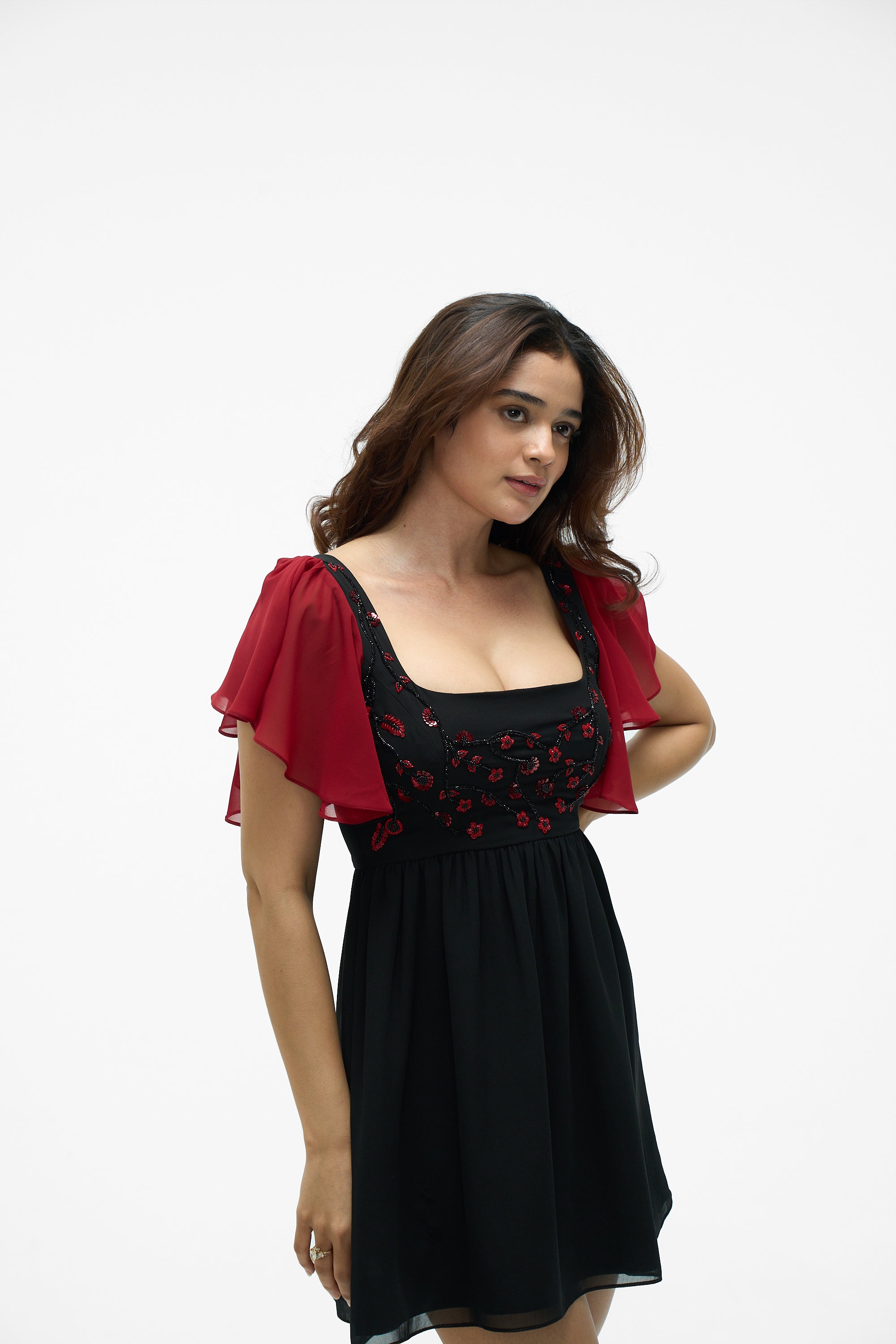 Style: Embroidered Georgette Mini Dress with Flutter Sleeves