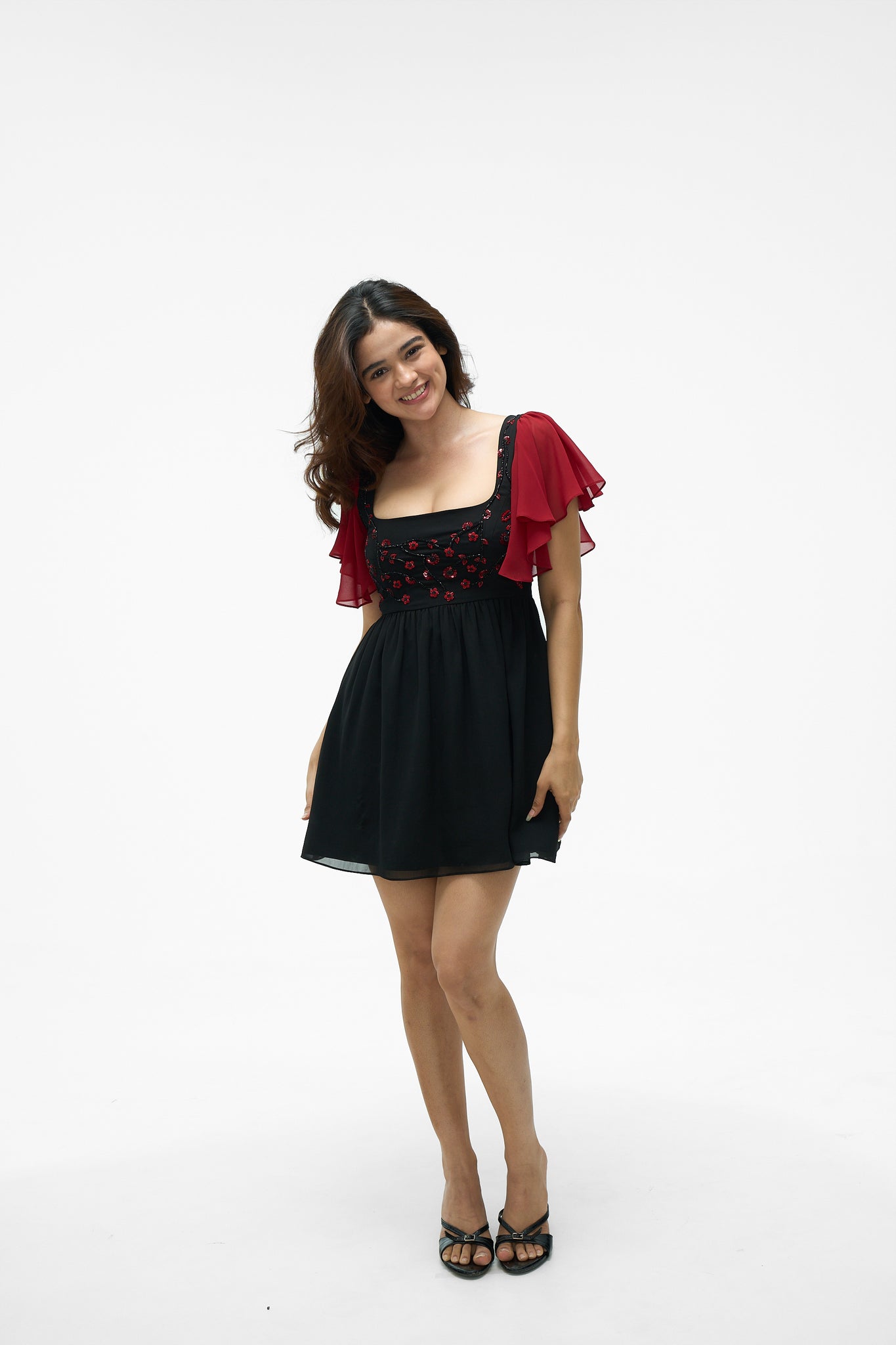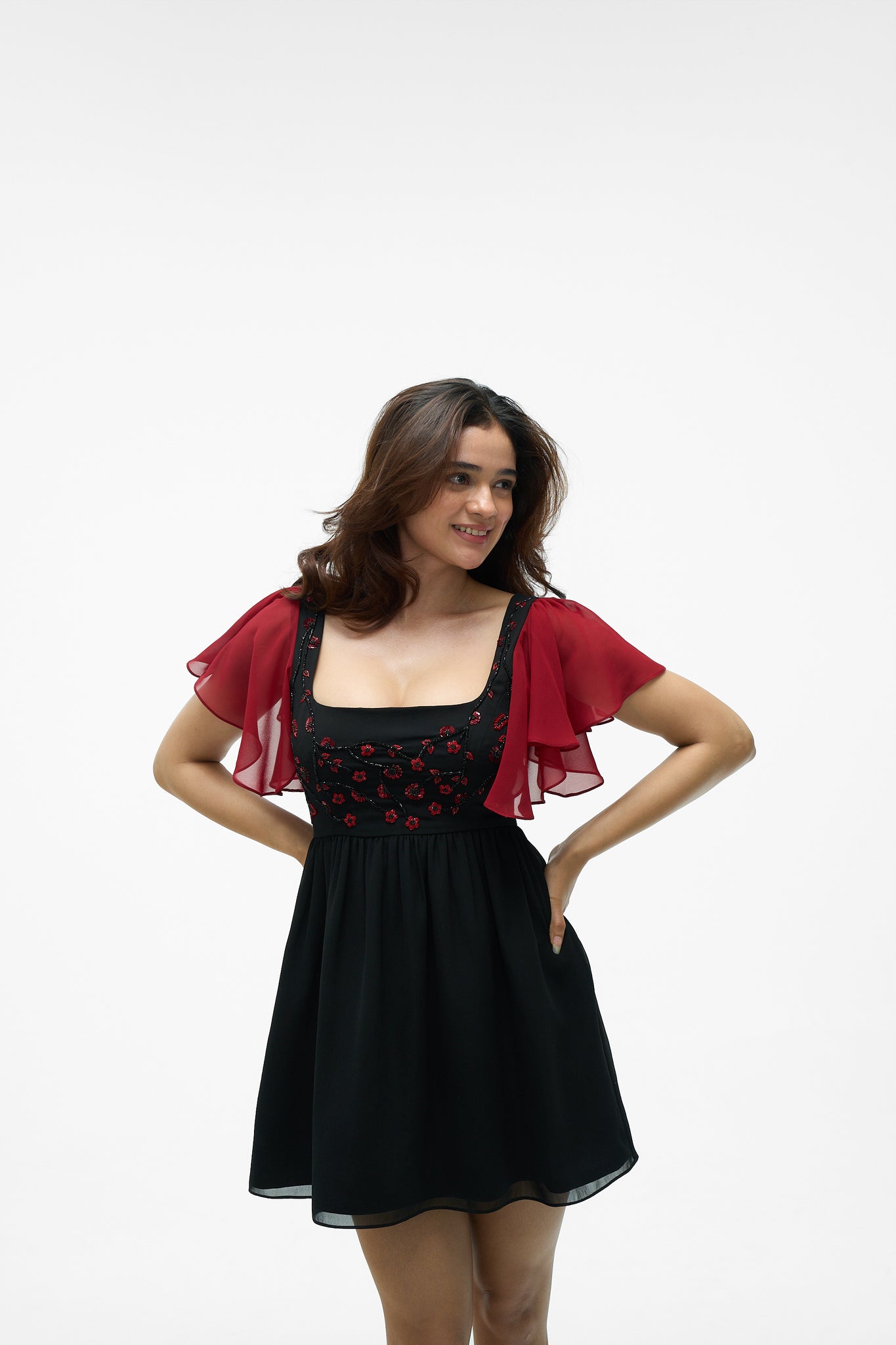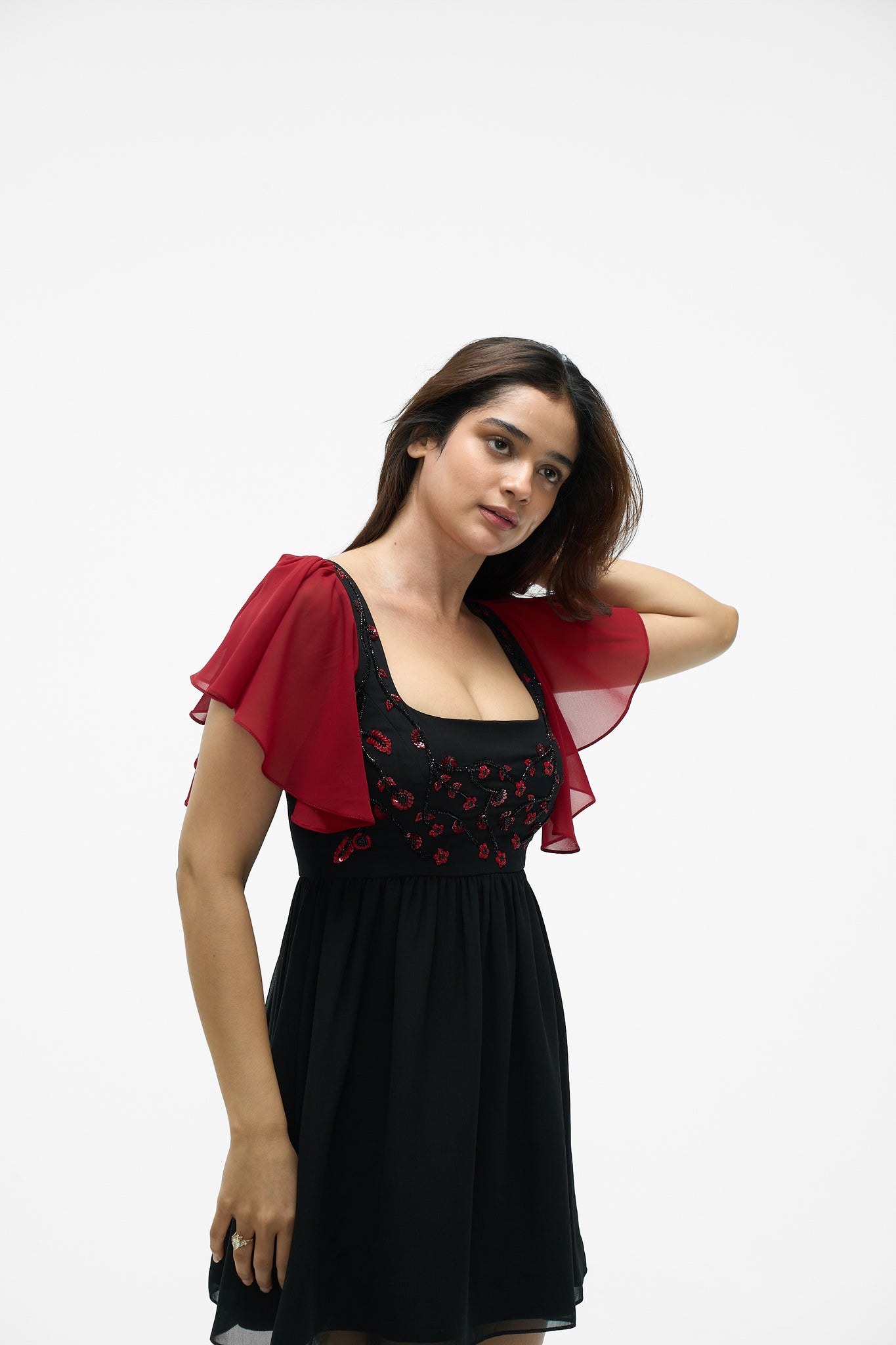 Style: Embroidered Georgette Mini Dress with Flutter Sleeves