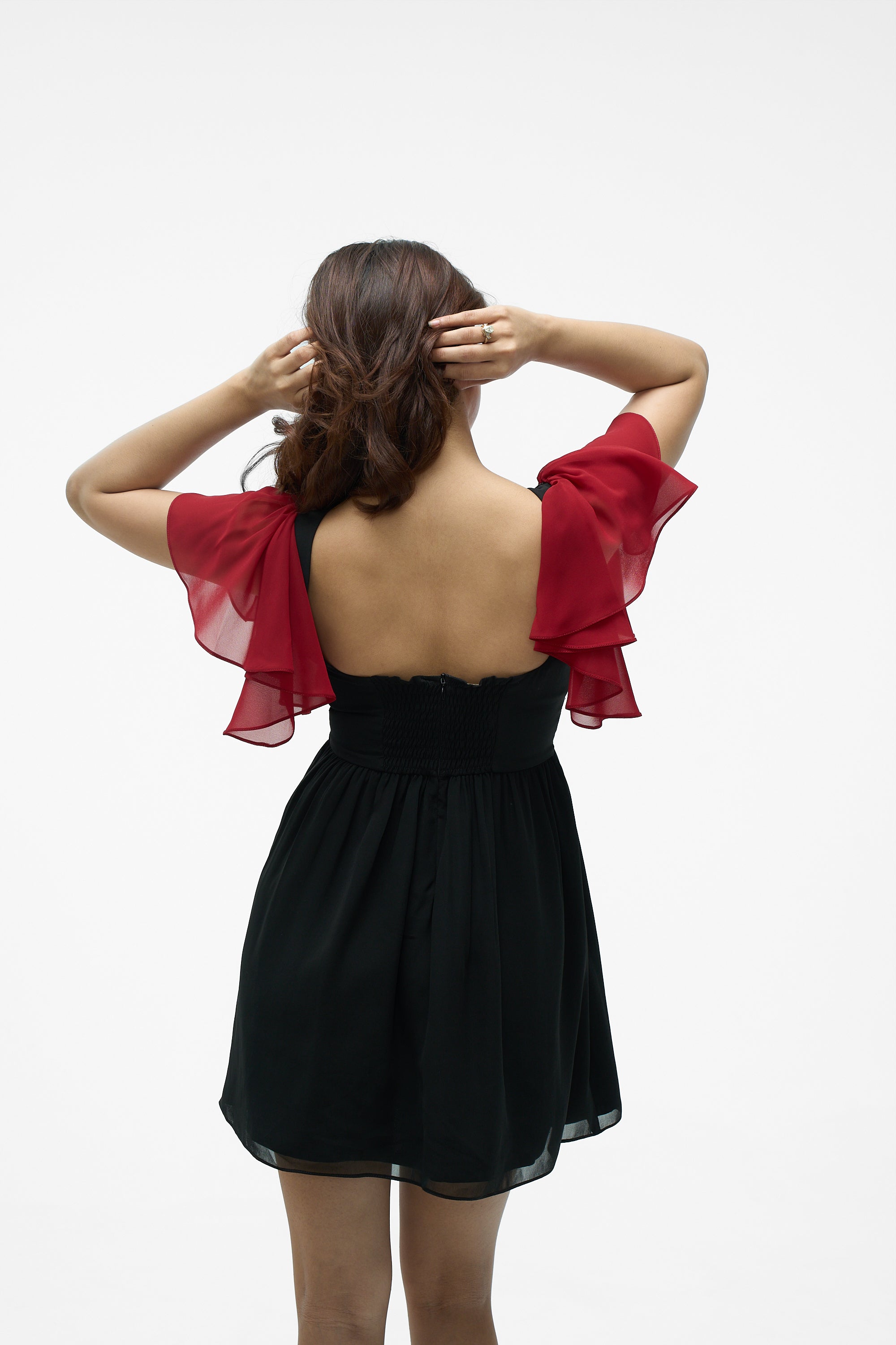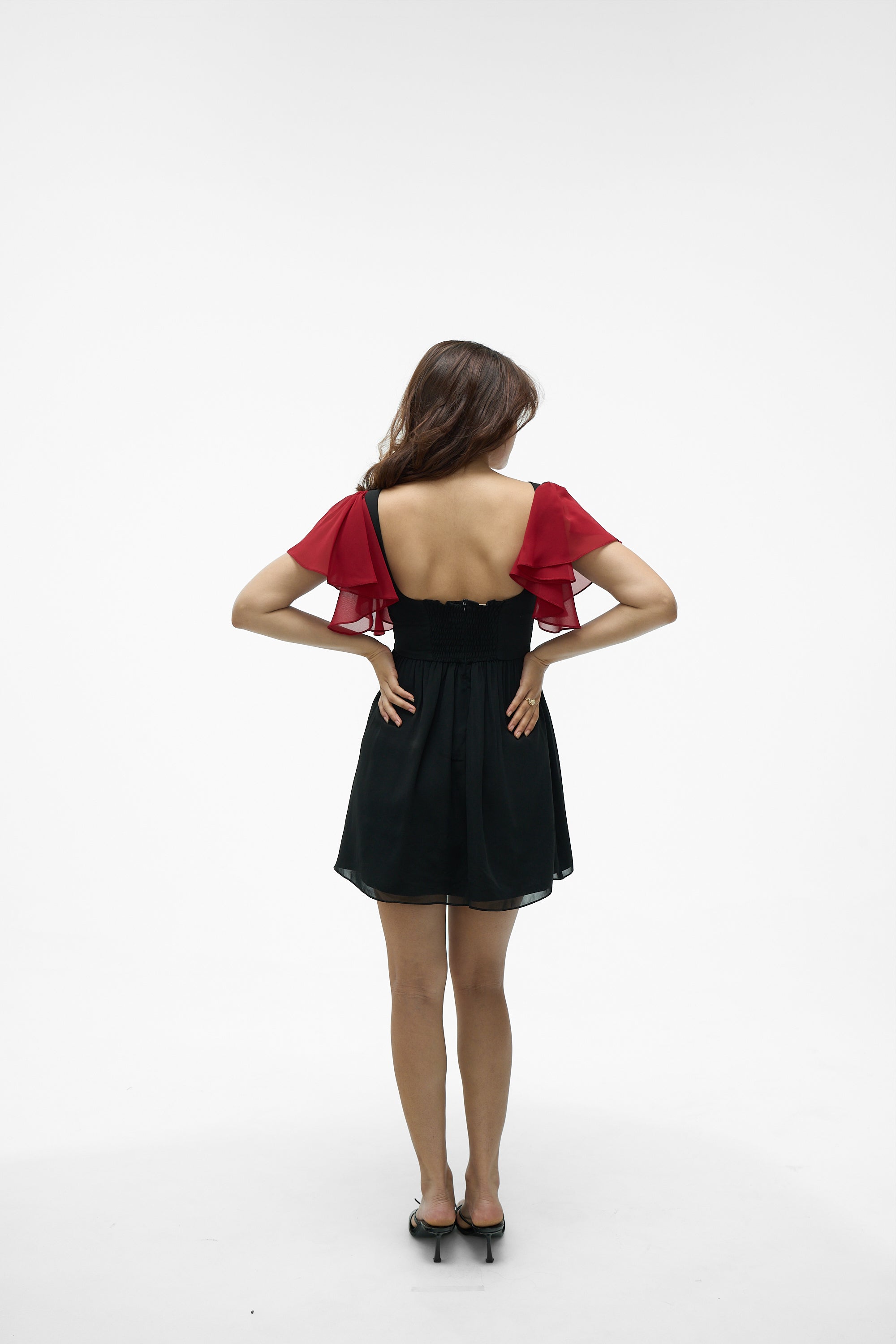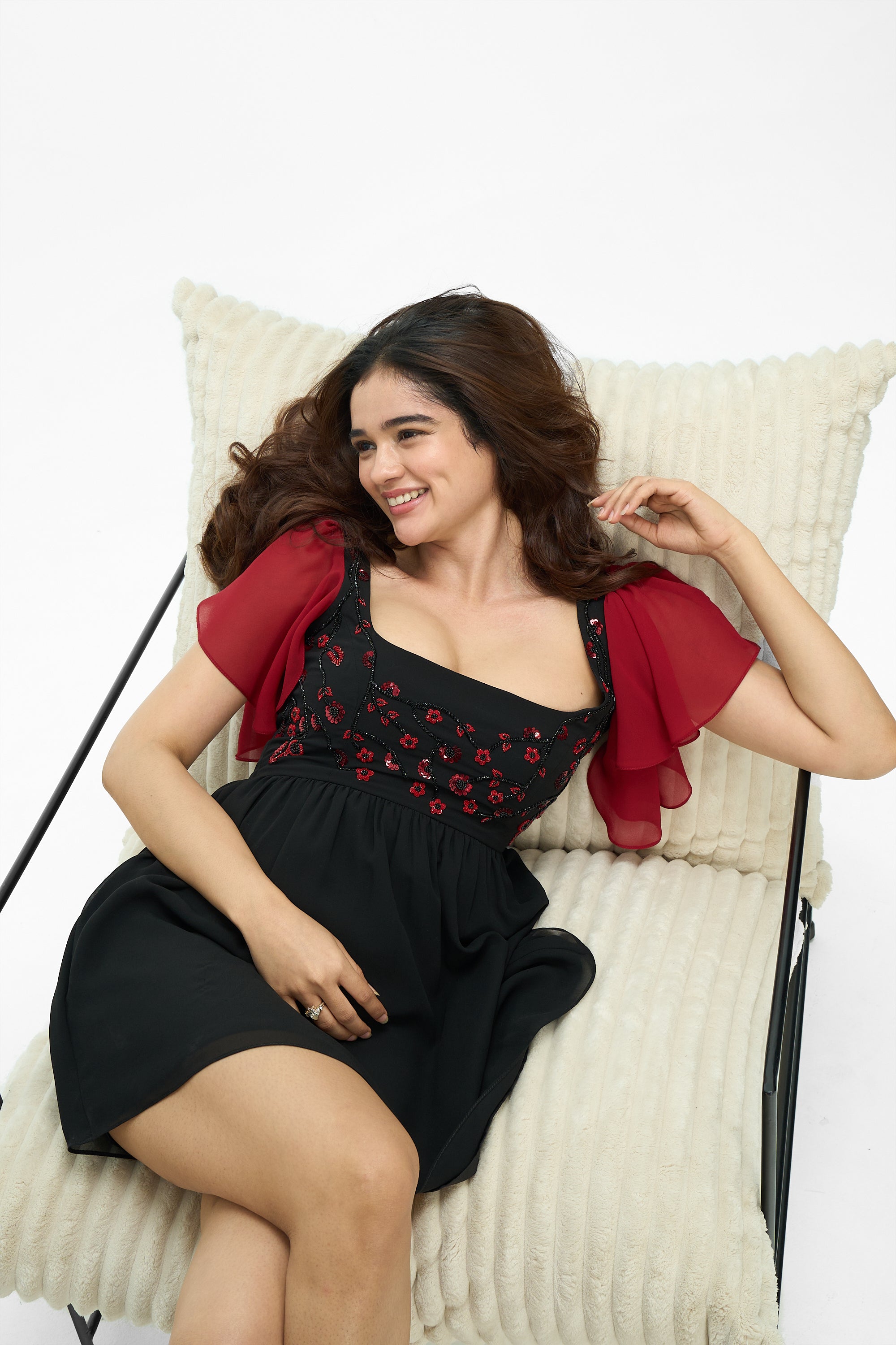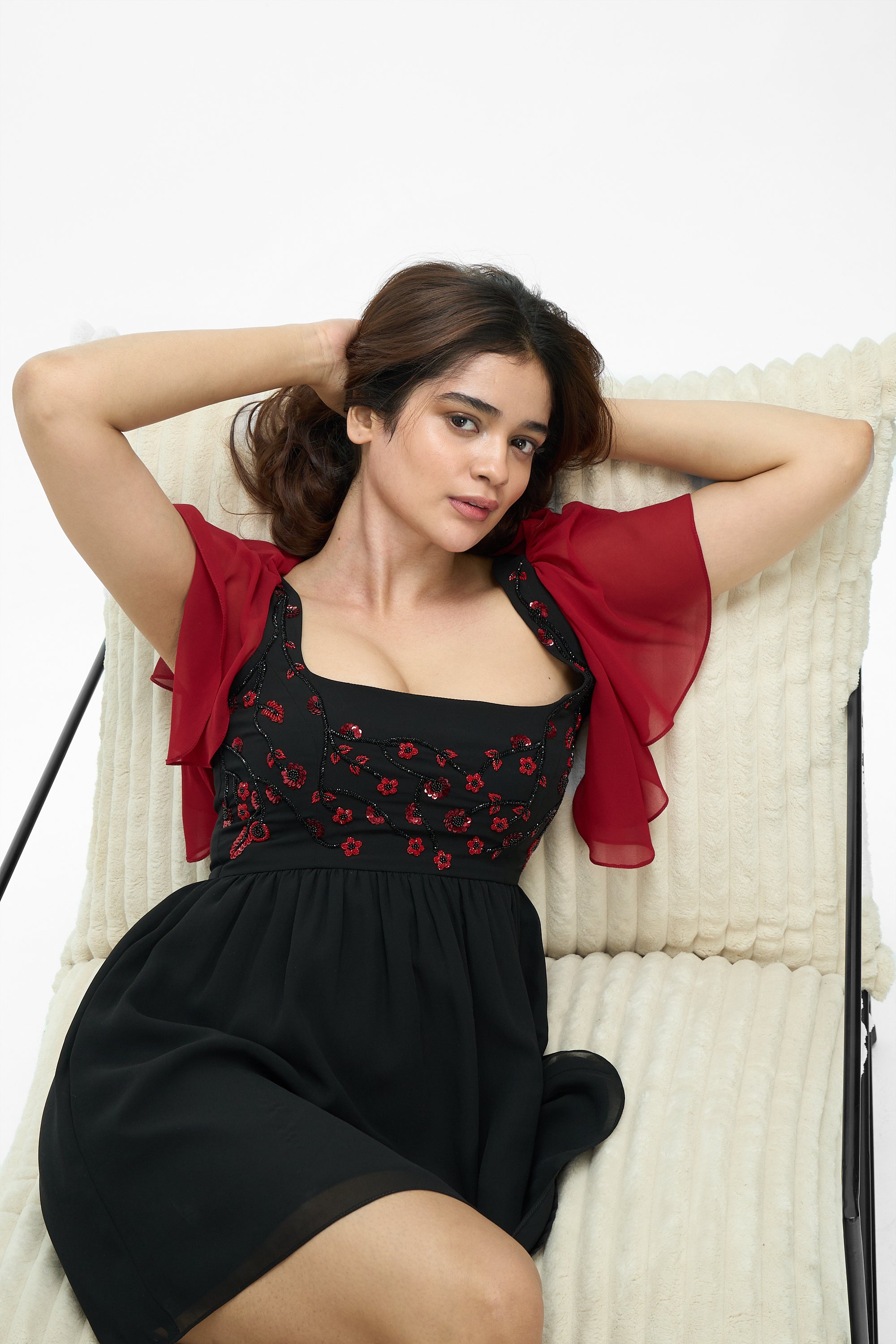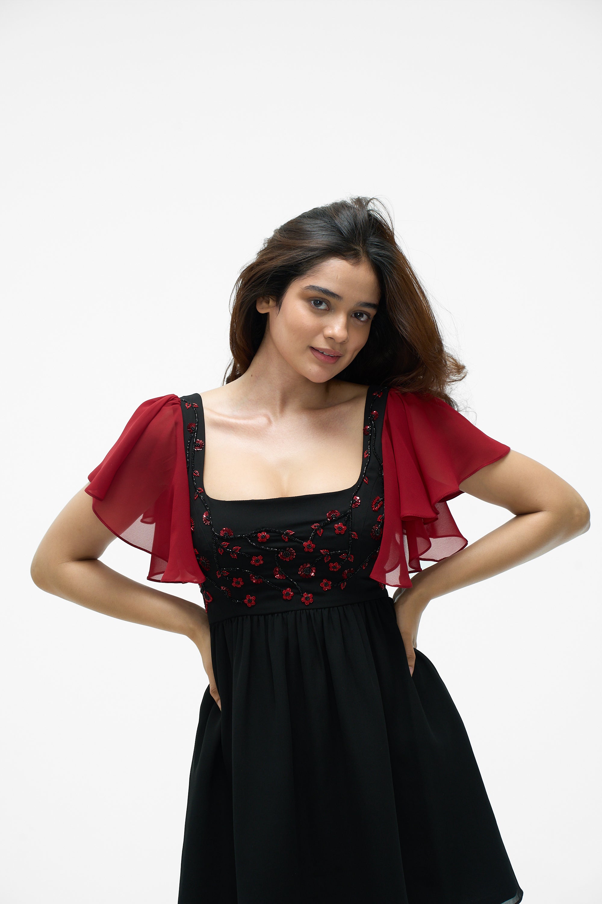 Details: A babydoll silhouette crafted from georgette, featuring an intricately beaded bodice, statement red flutter sleeves, and a comfortable smocked panel at the back for a perfect fit.