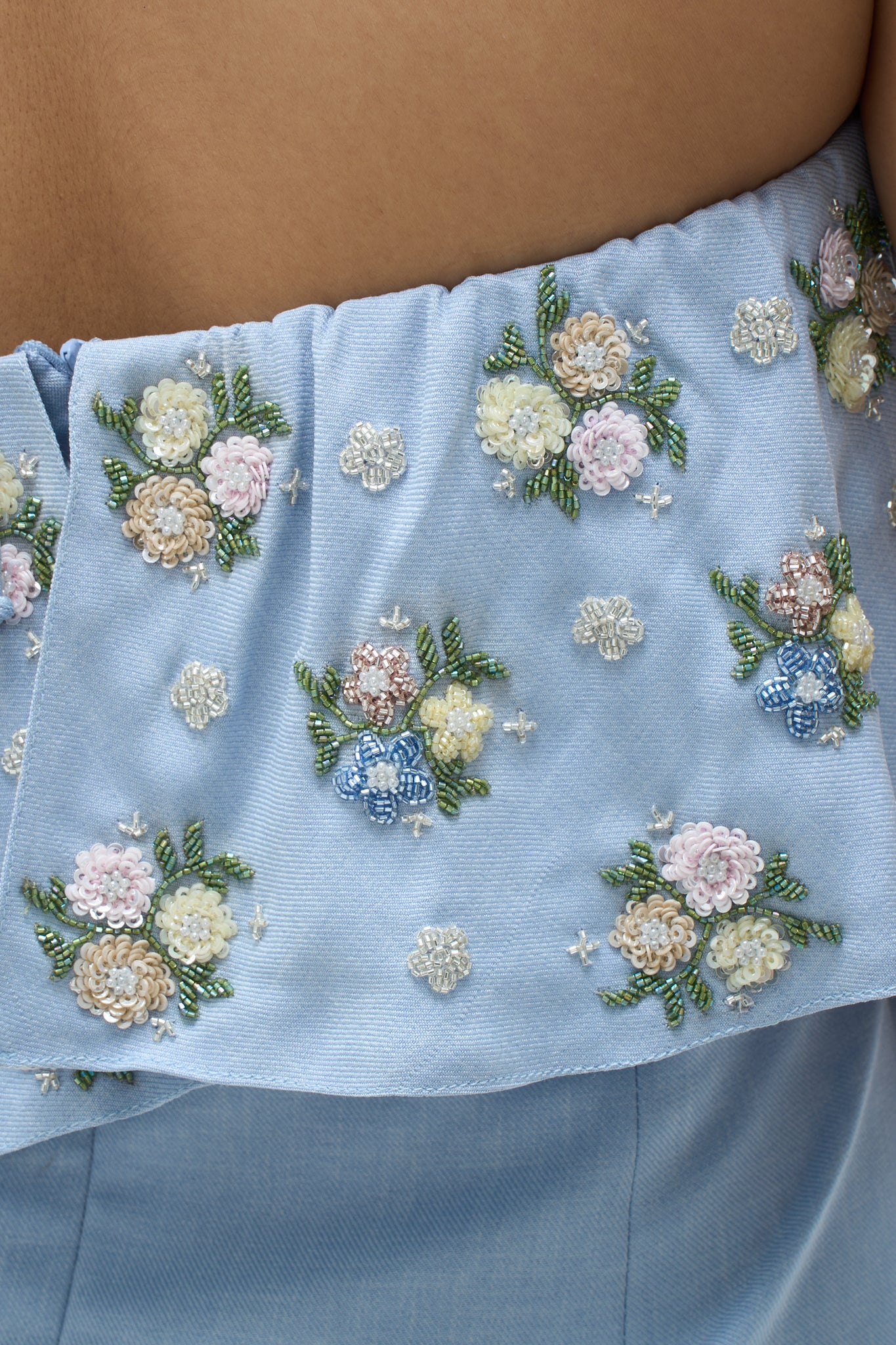 Details: Features a wide, embroidered flounce overlay on the bodice; adjustable halter neck tie-up closure; open back with a concealed zipper.