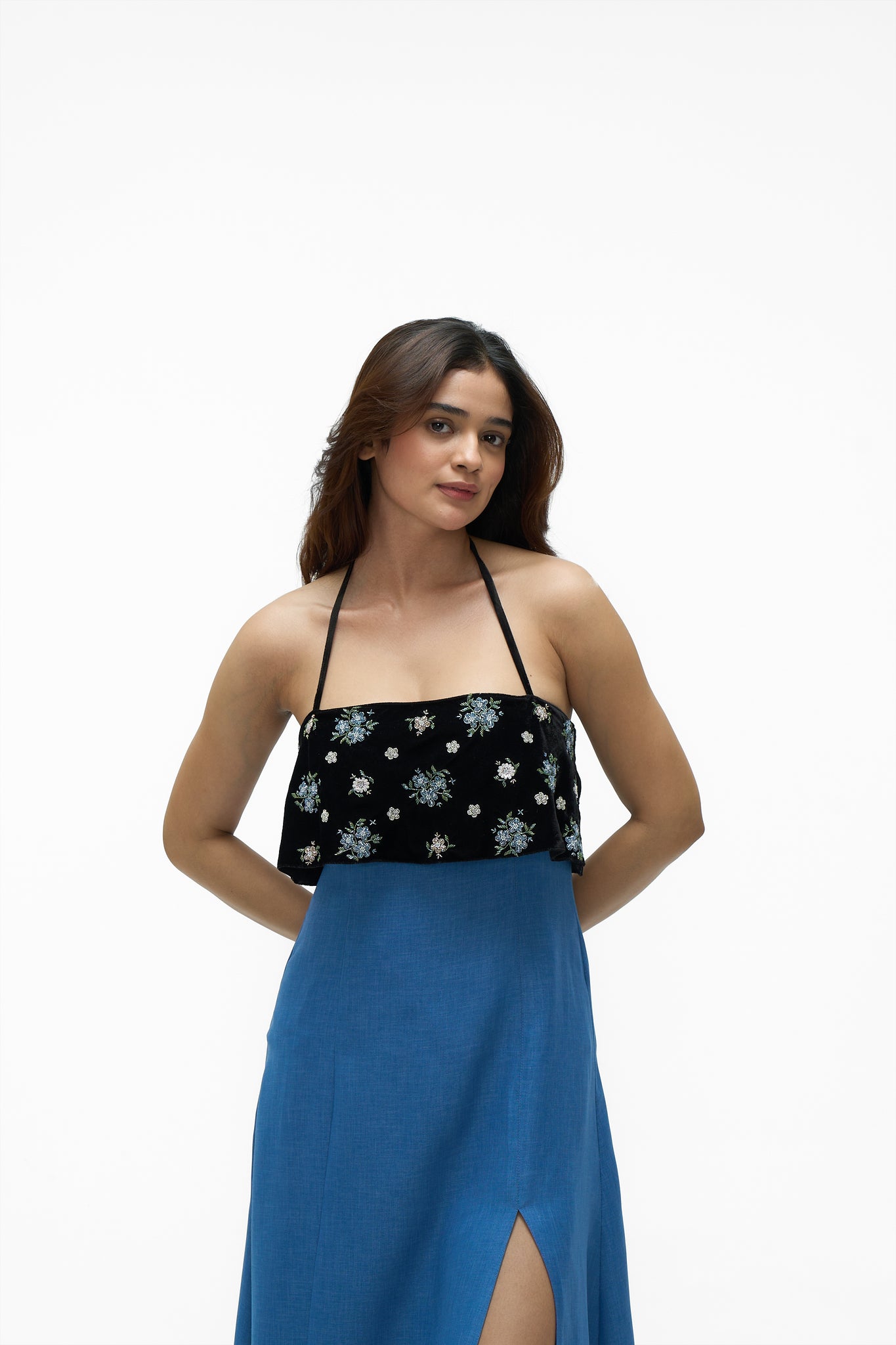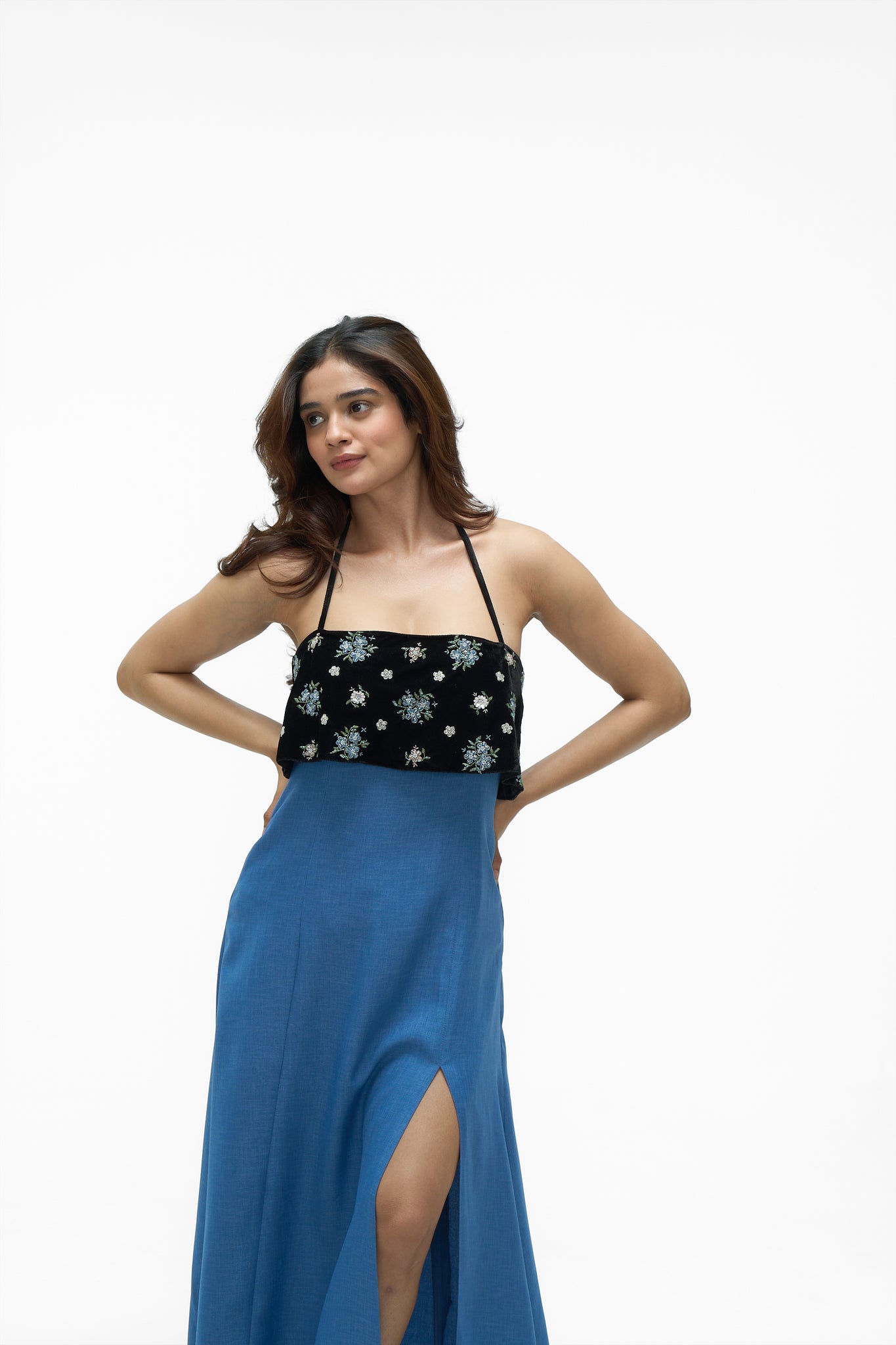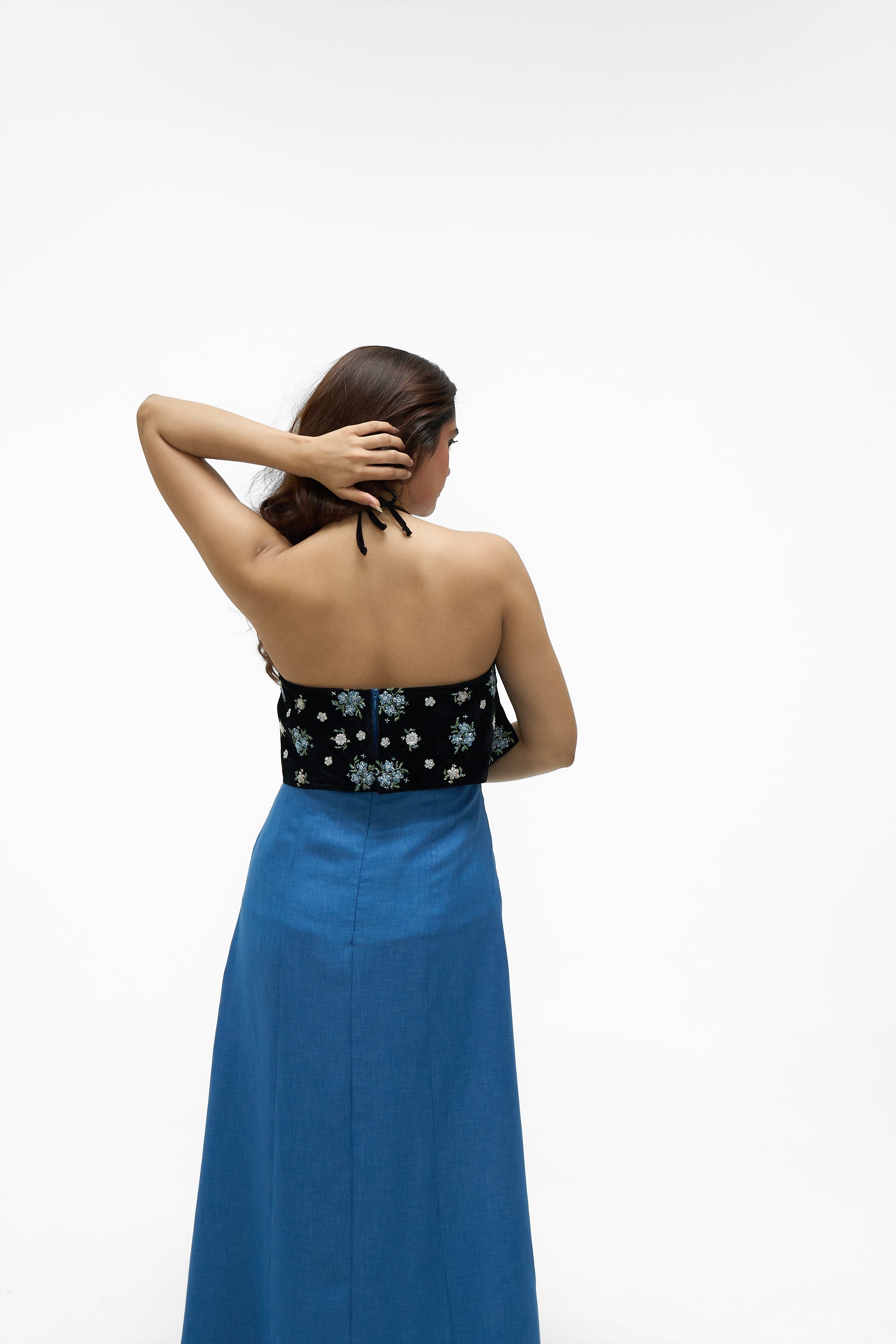 • Details: A striking color-blocked design featuring an embroidered velvet flounce overlay on the bodice and a contrasting solid blue skirt. The dress has an open back with an adjustable halter neck tie-up closure for a customized fit.