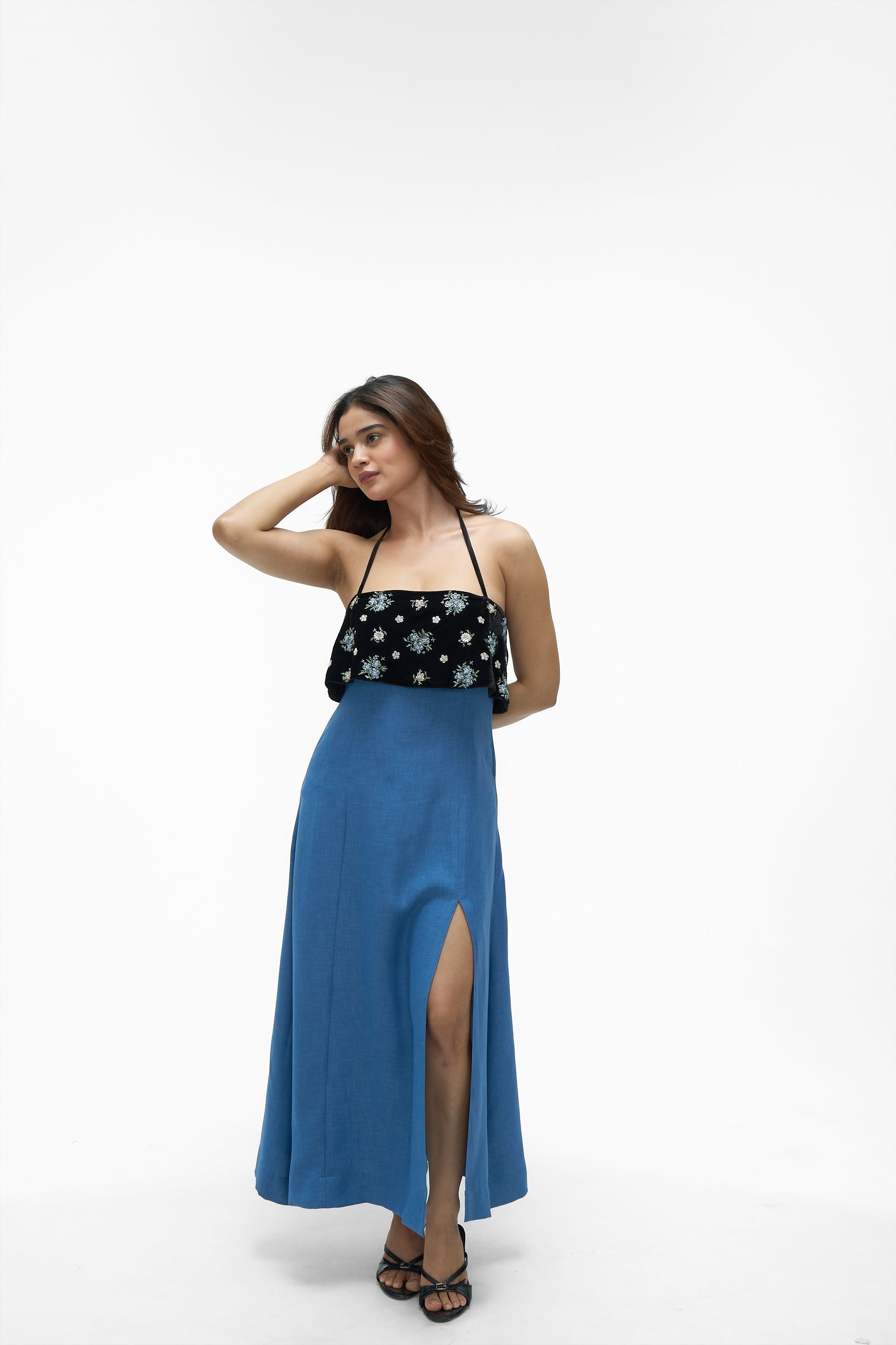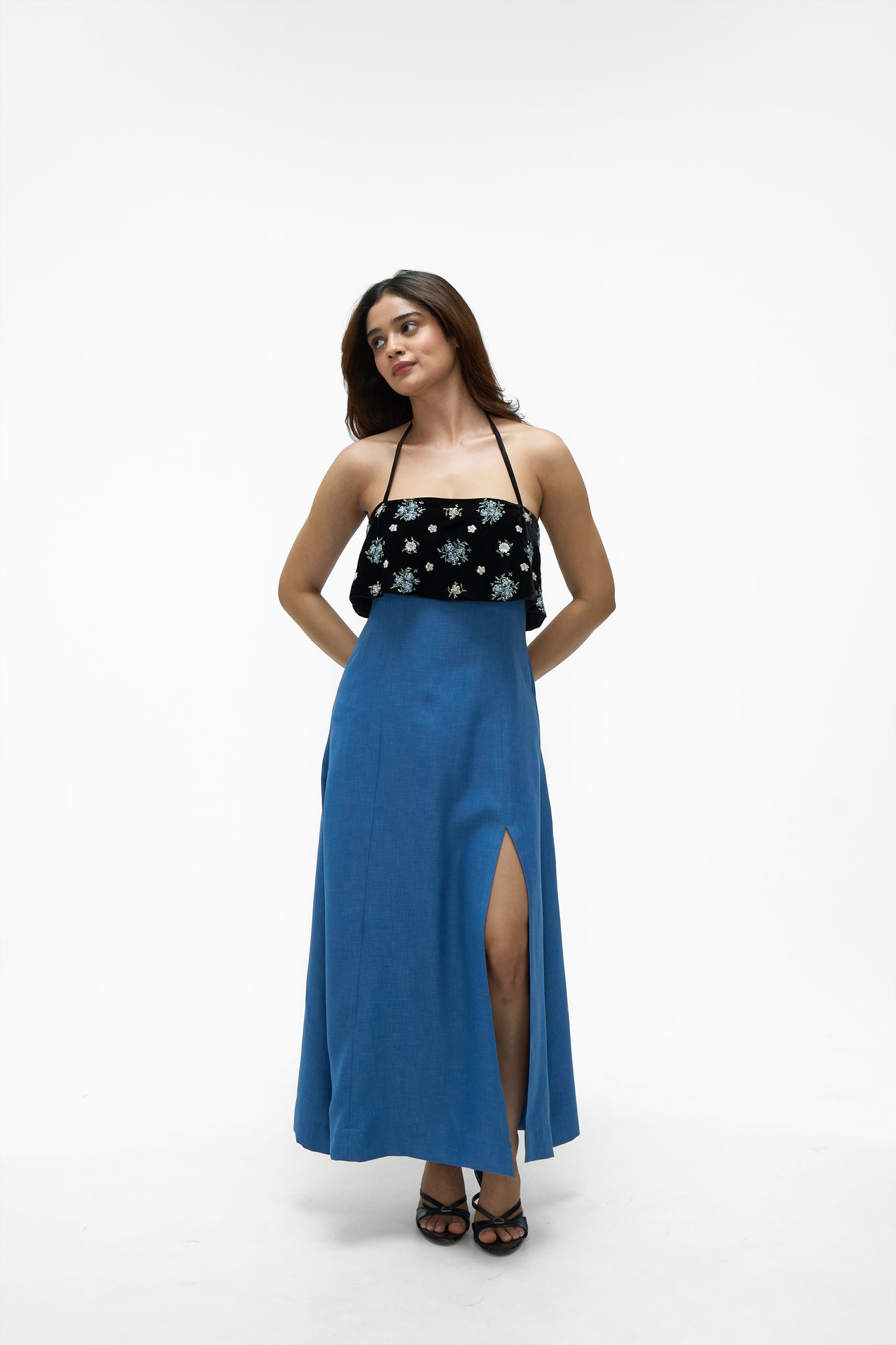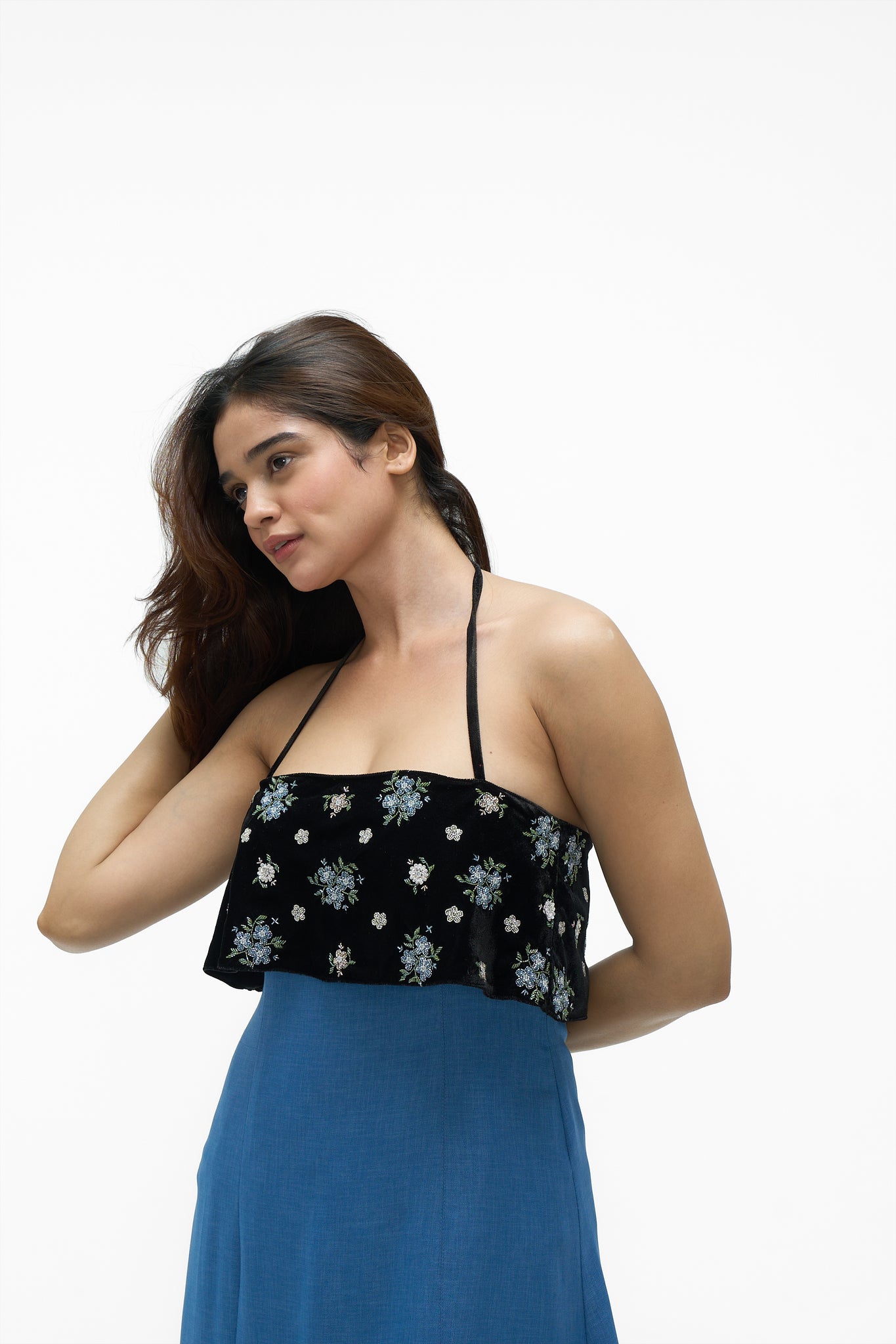 • Details: A striking color-blocked design featuring an embroidered velvet flounce overlay on the bodice and a contrasting solid blue skirt. The dress has an open back with an adjustable halter neck tie-up closure for a customized fit.