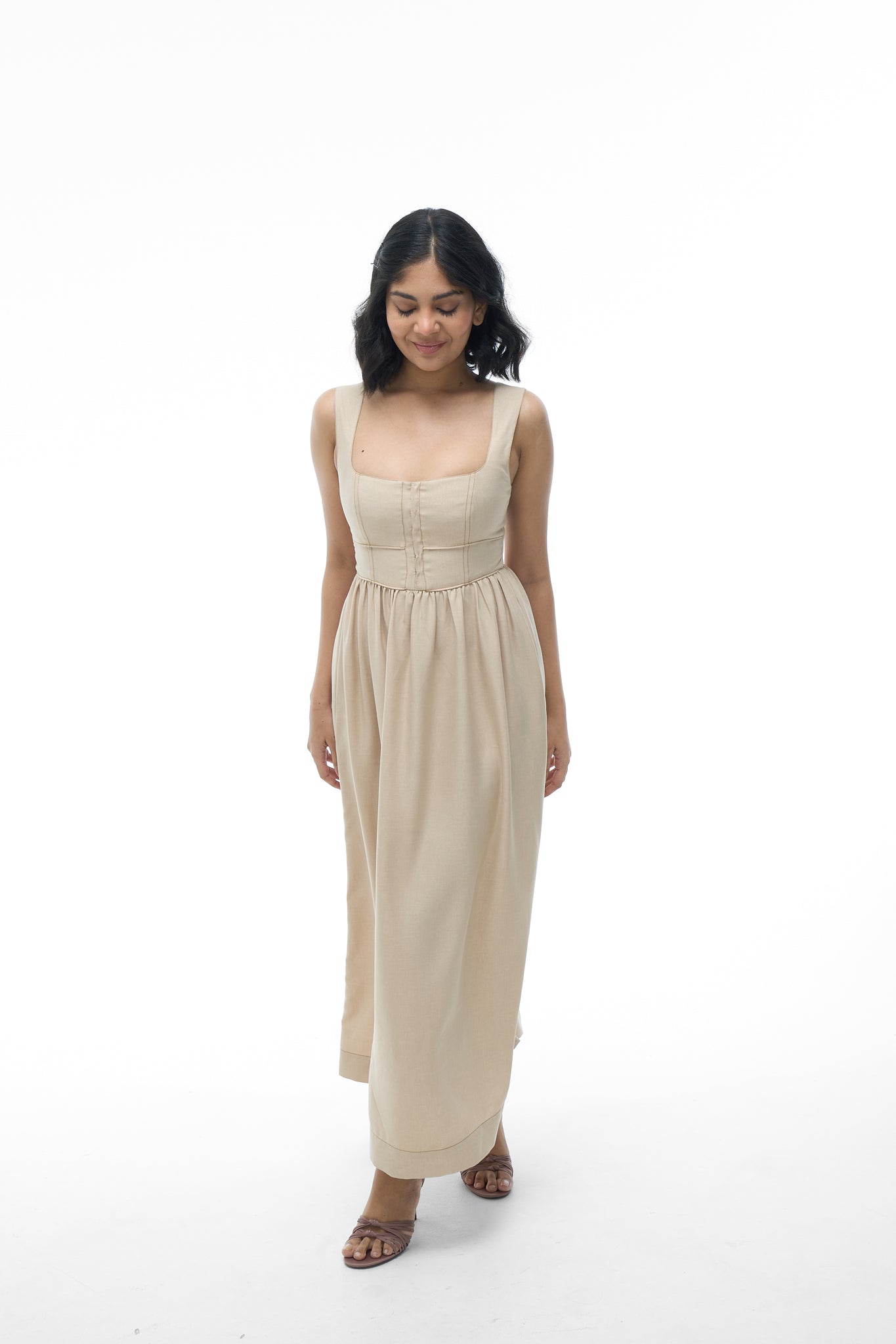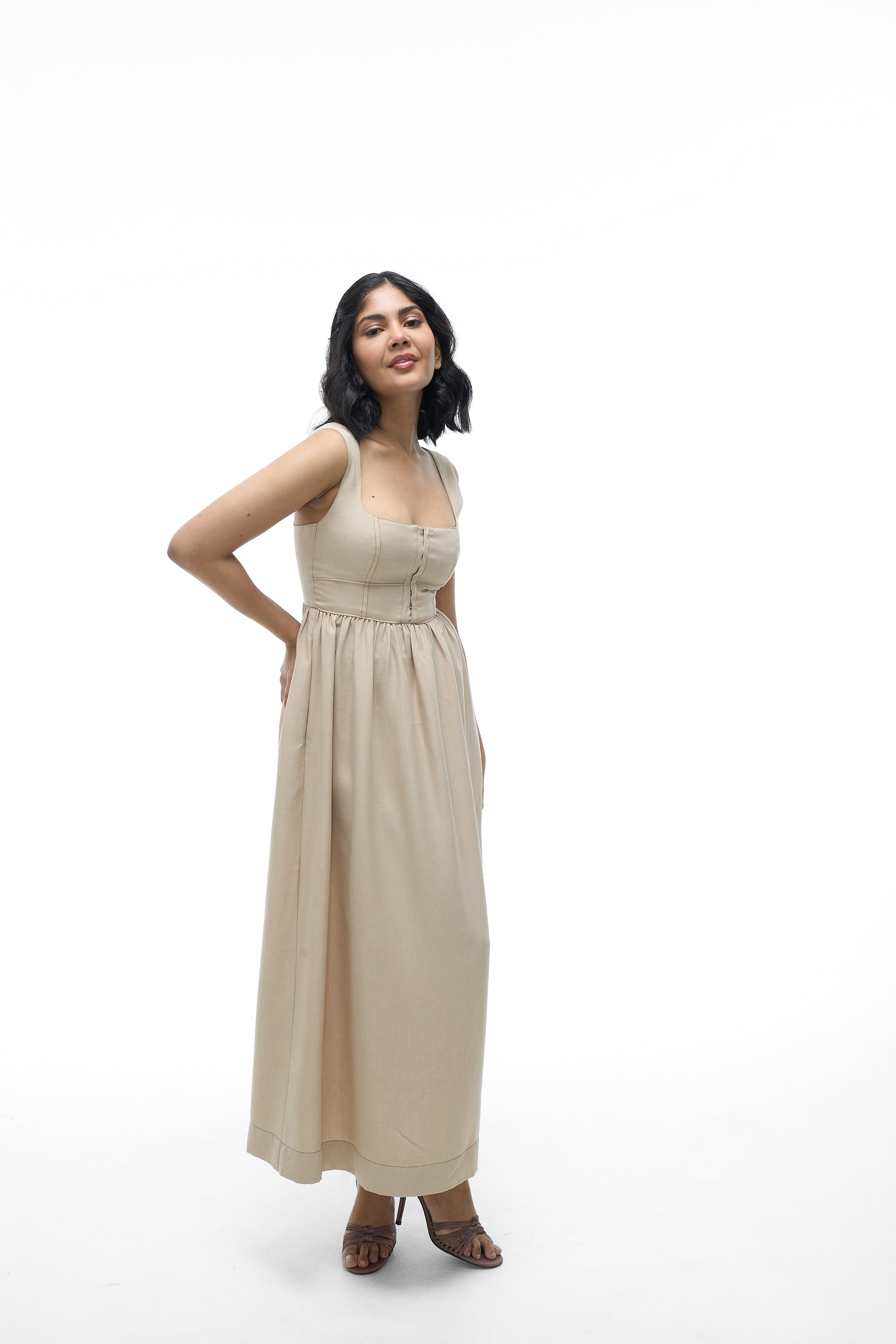 - Fit: Structured front bodice with a fully smocked back panel and zipper for a flexible fit