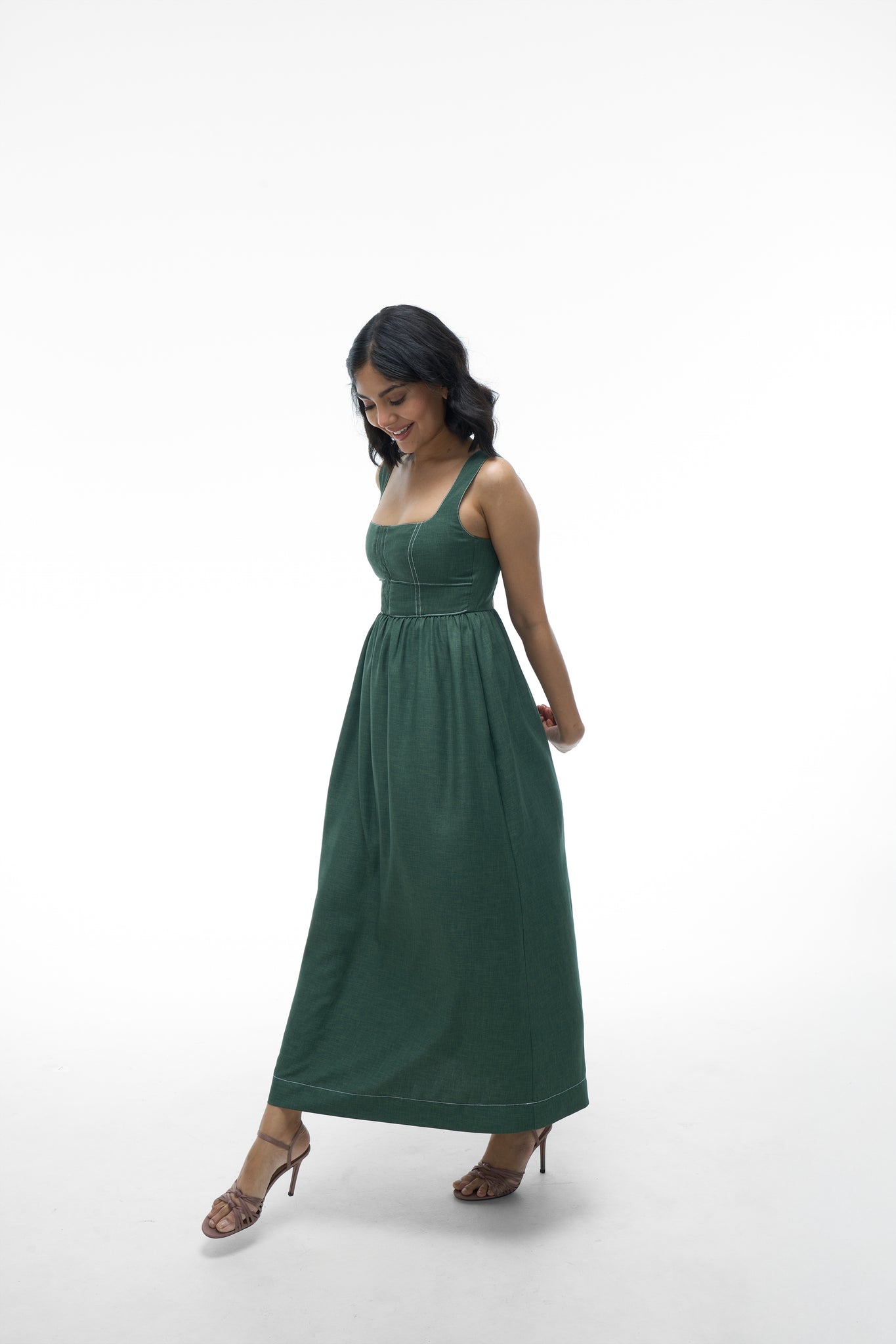 - Skirt: Full, gathered midi skirt