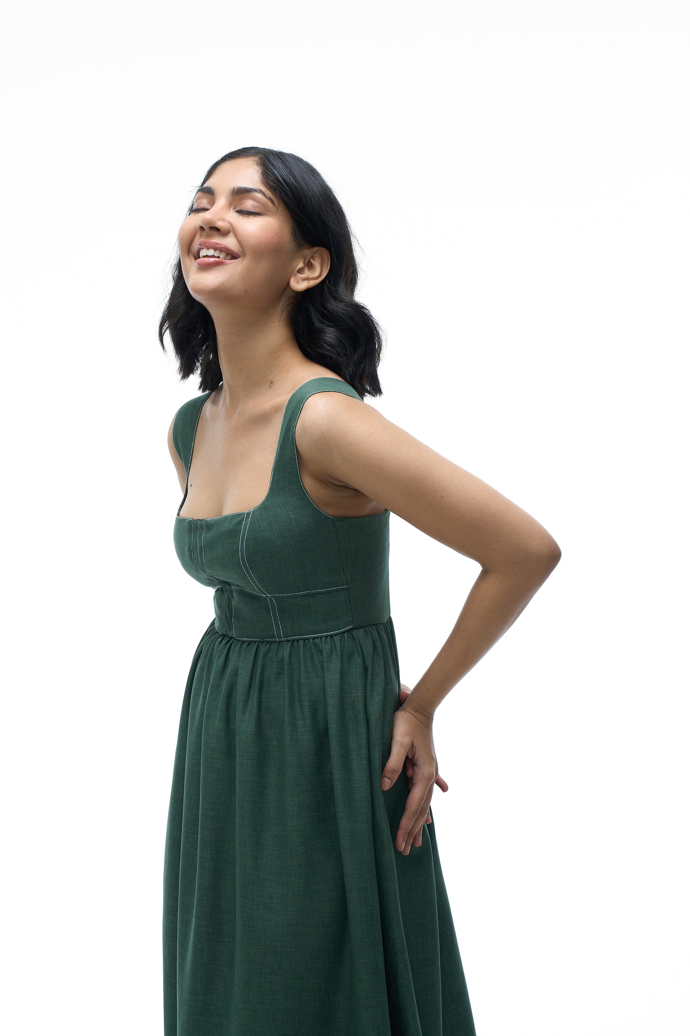 - Fit: Structured front bodice with a fully smocked back panel and zipper for a flexible fit