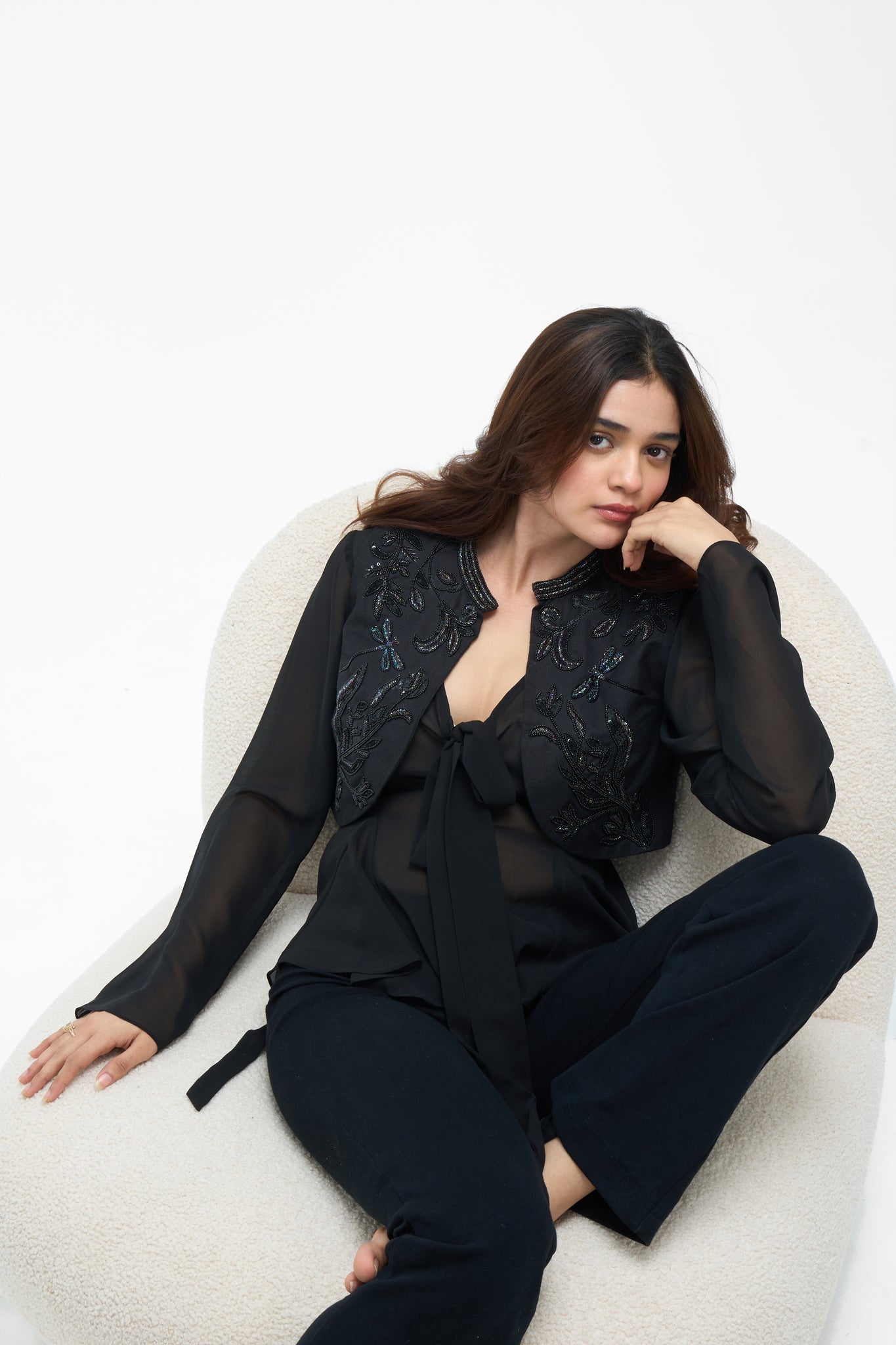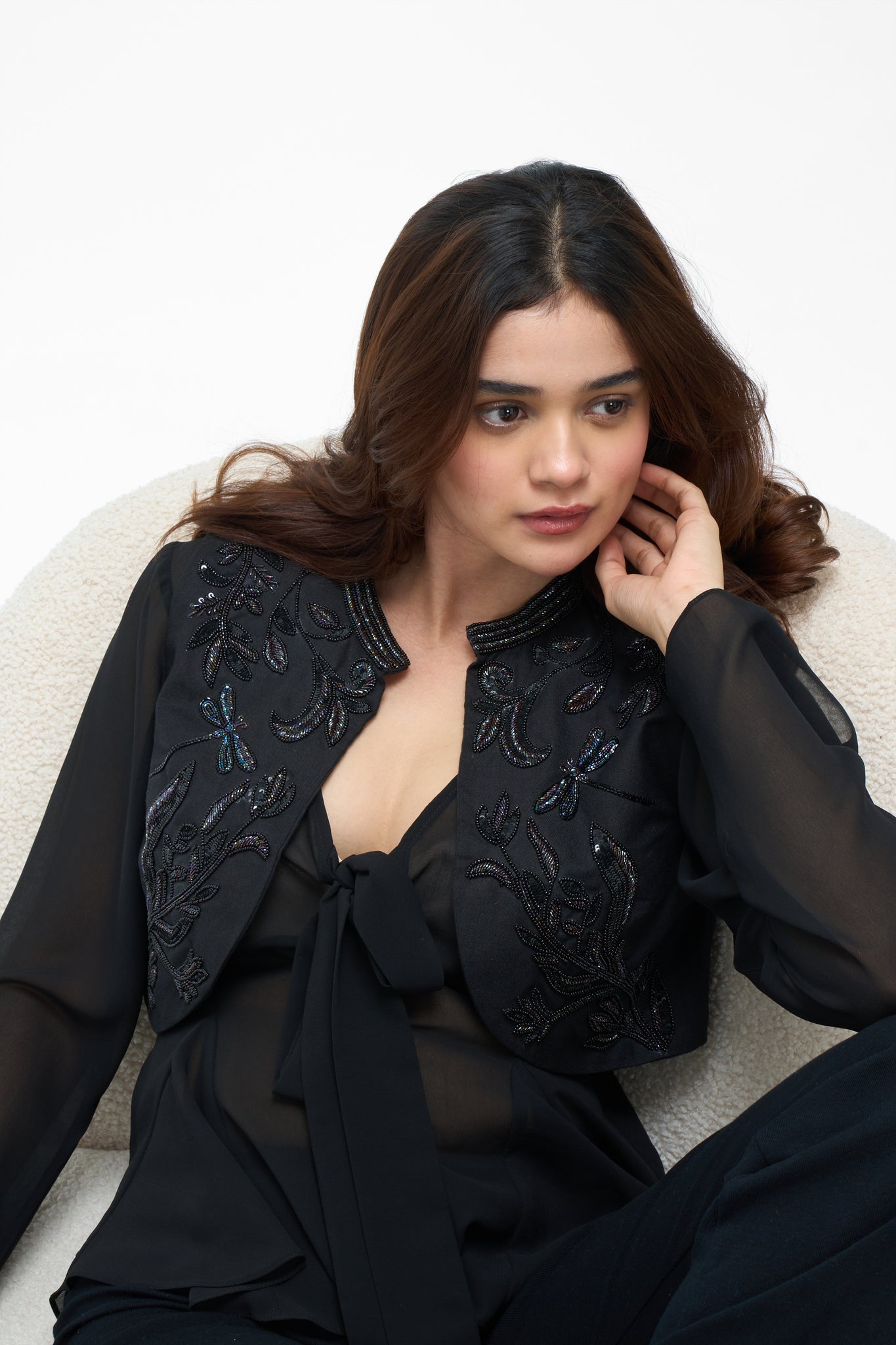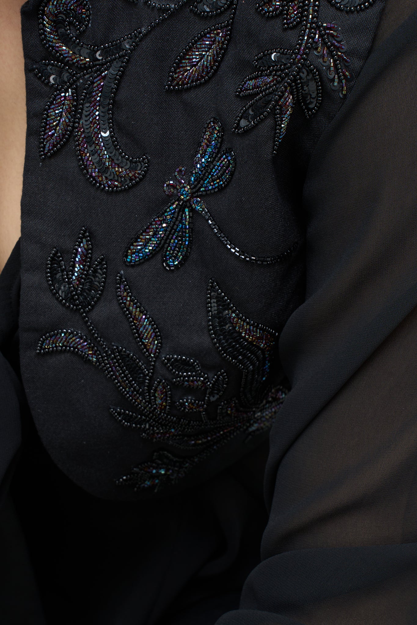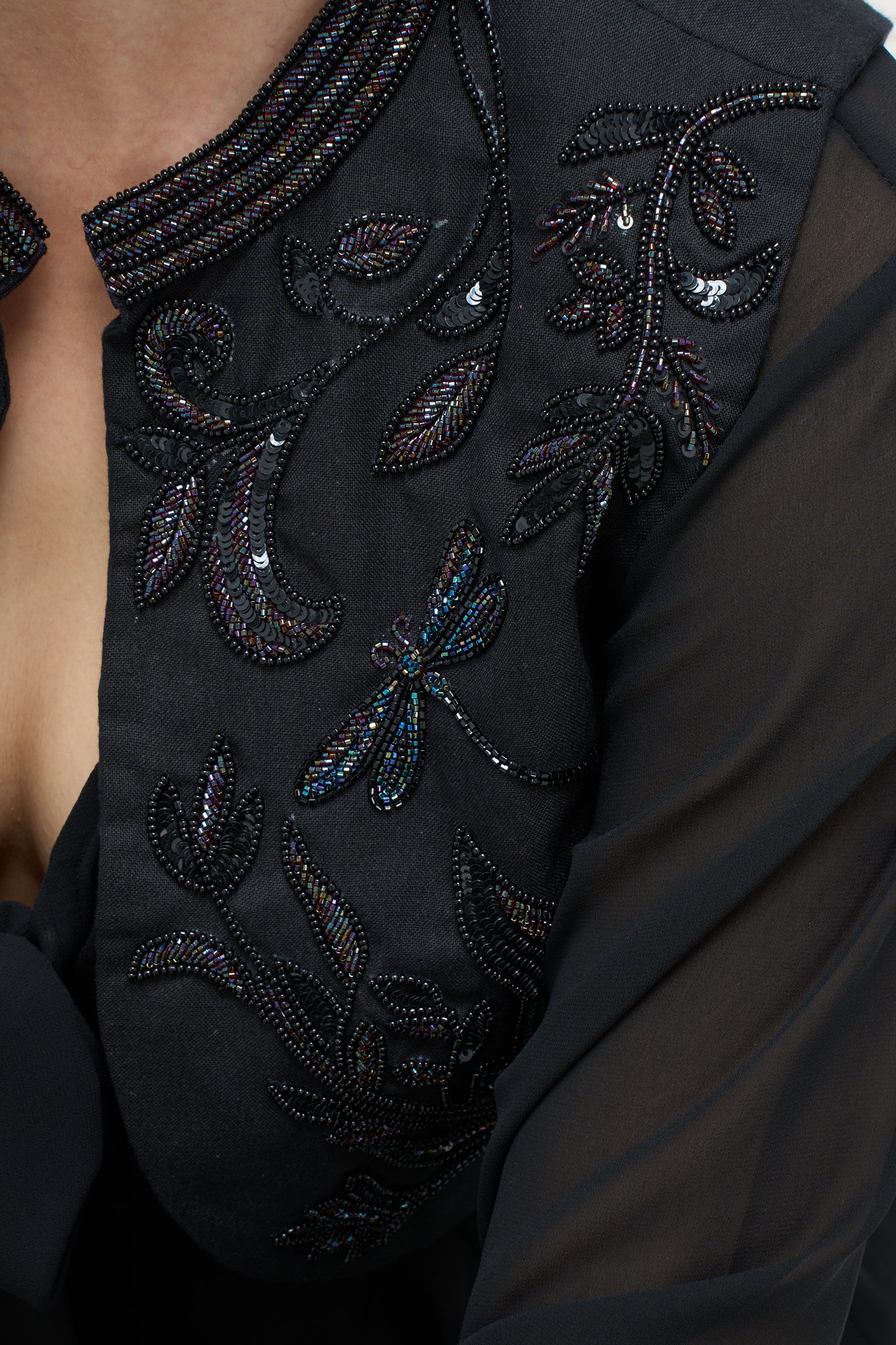 Beadwork: Hand-embroidered with tonal black and iridescent bugle beads, seed beads, and sequins, featuring intricate dragonfly and botanical vine motifs.