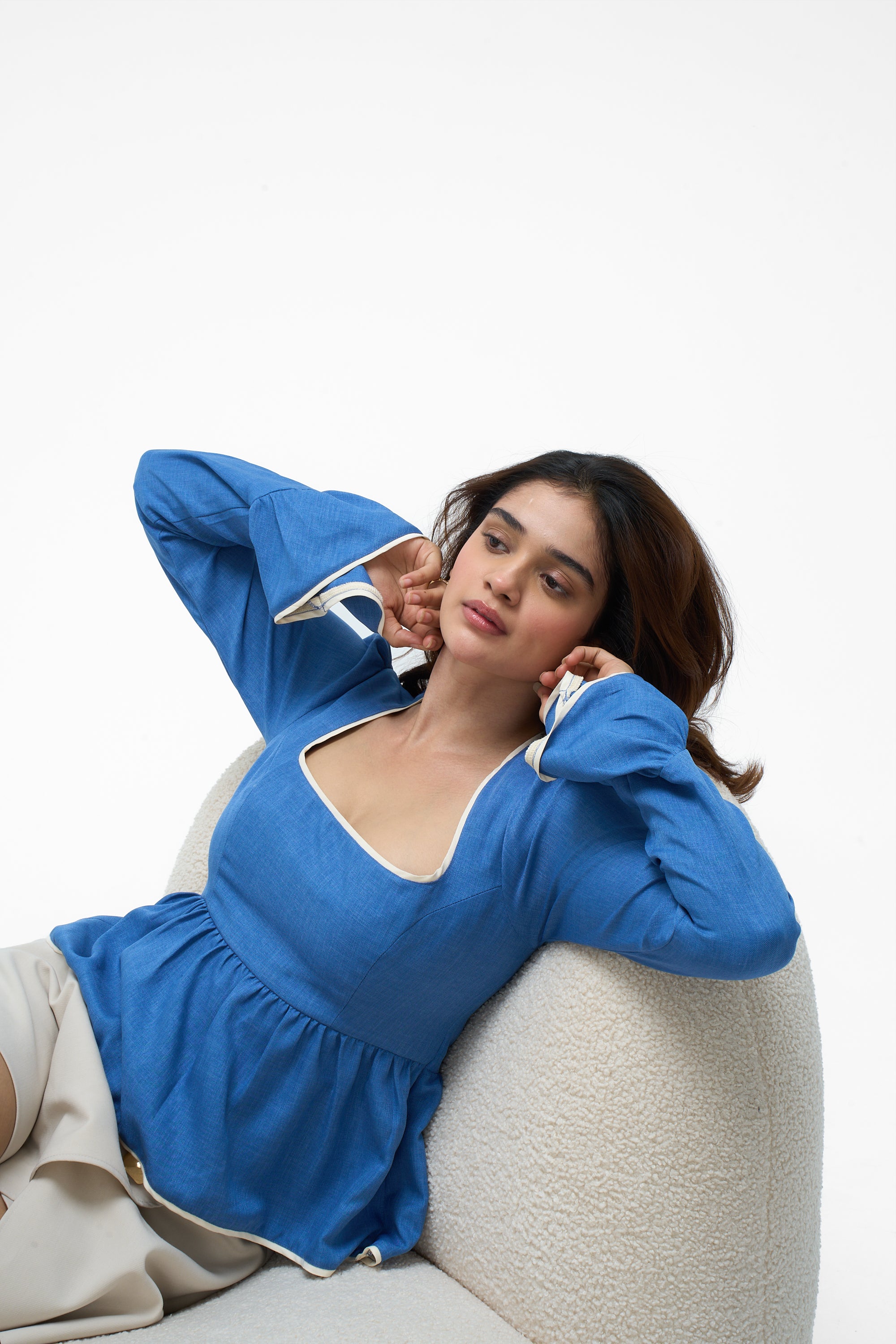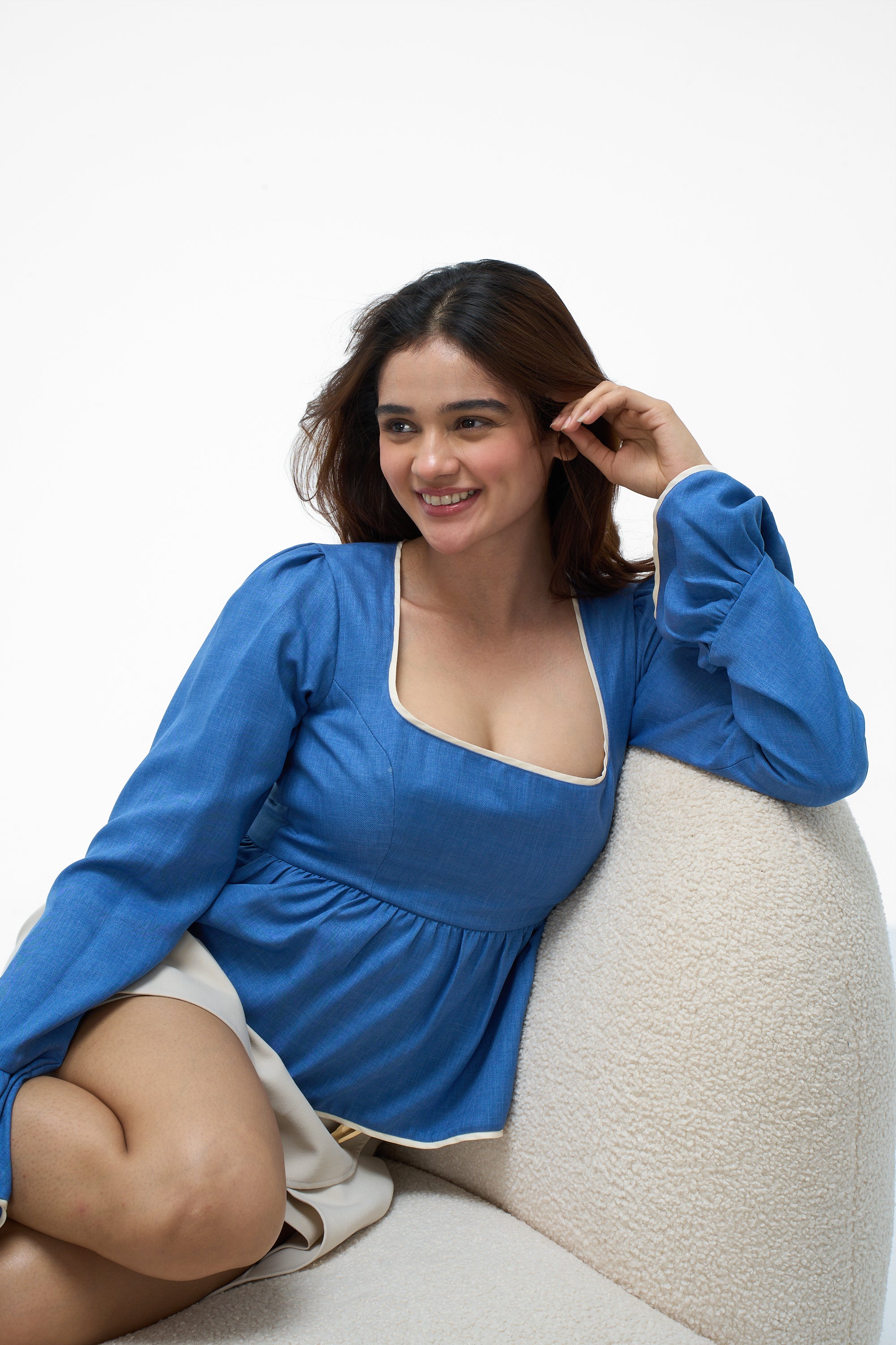 Details: Crafted from breathable cotton, this top features elegant contrast piping along the square neckline, bell cuffs, and peplum hem. The design includes a structured bodice and a concealed back zipper for a perfect fit.