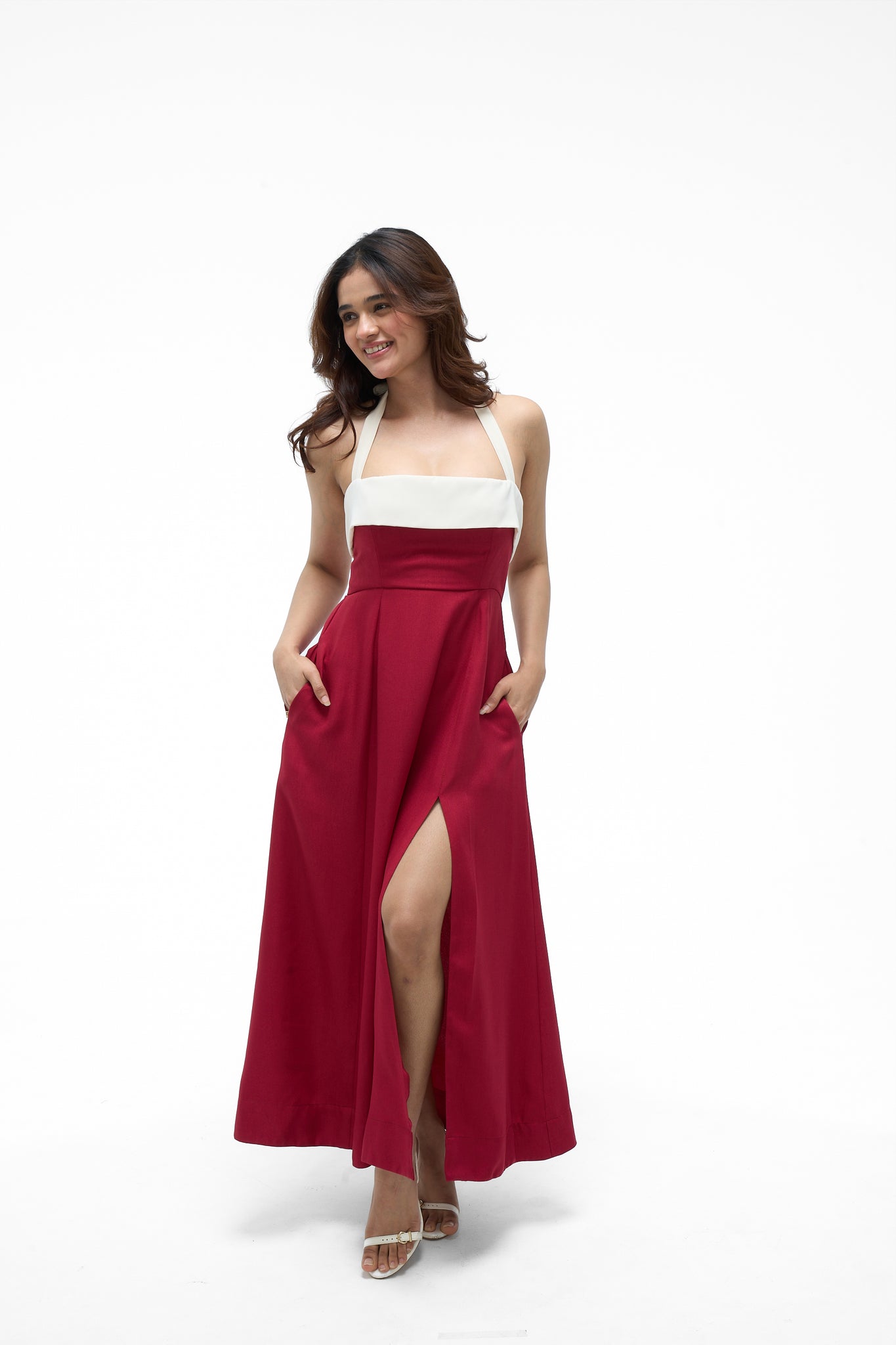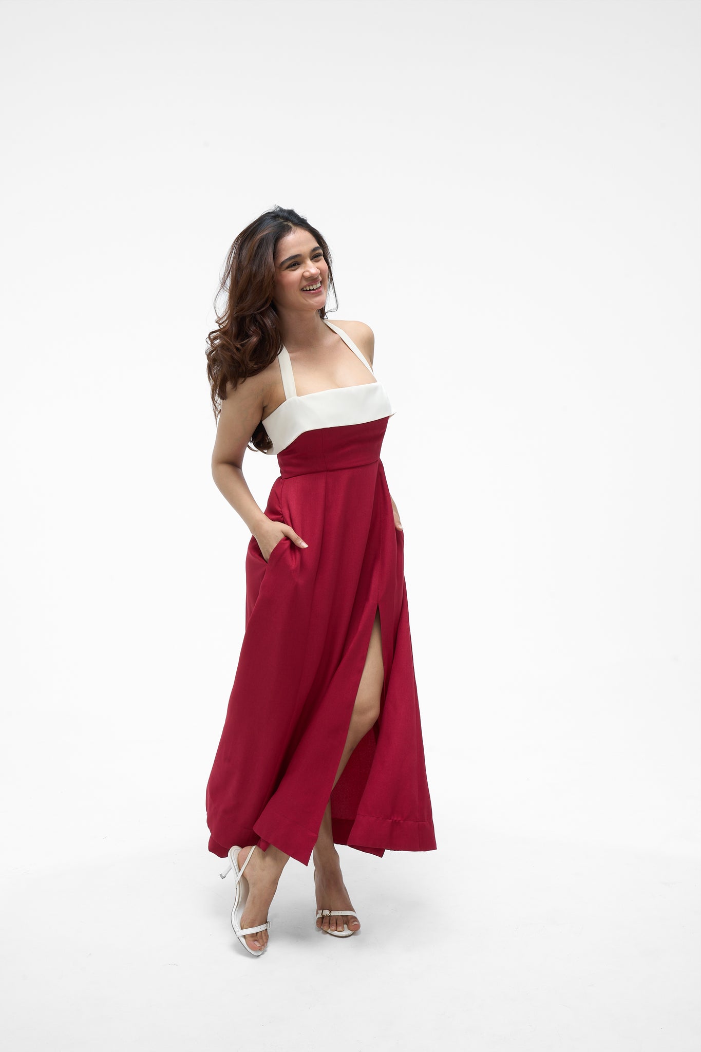 Details: A striking minimalist design featuring a contrast ivory bandeau and wide halter straps that tie at the neck. The dress has an open back and a comfortable smocked panel for an adjustable and flattering silhouette.