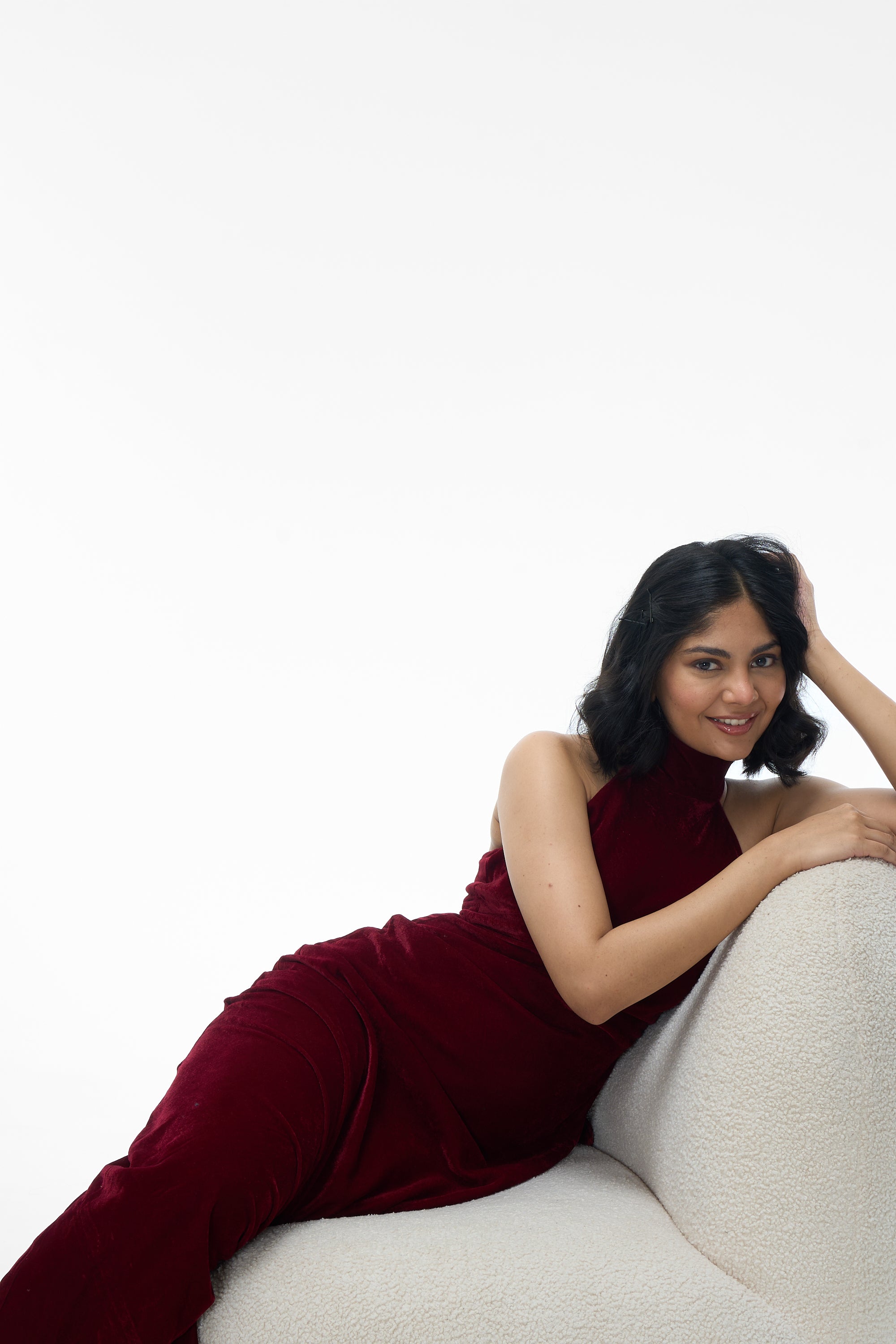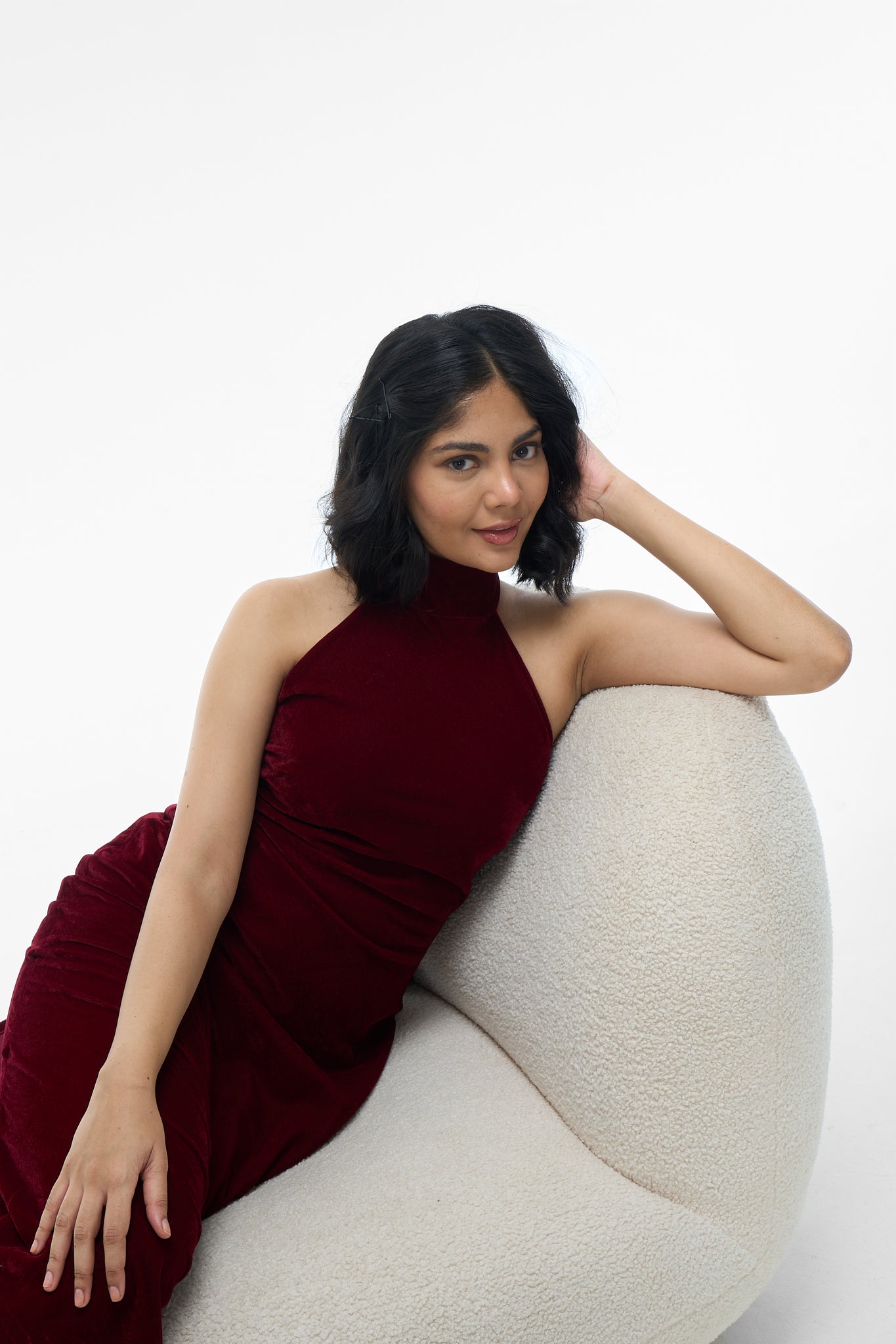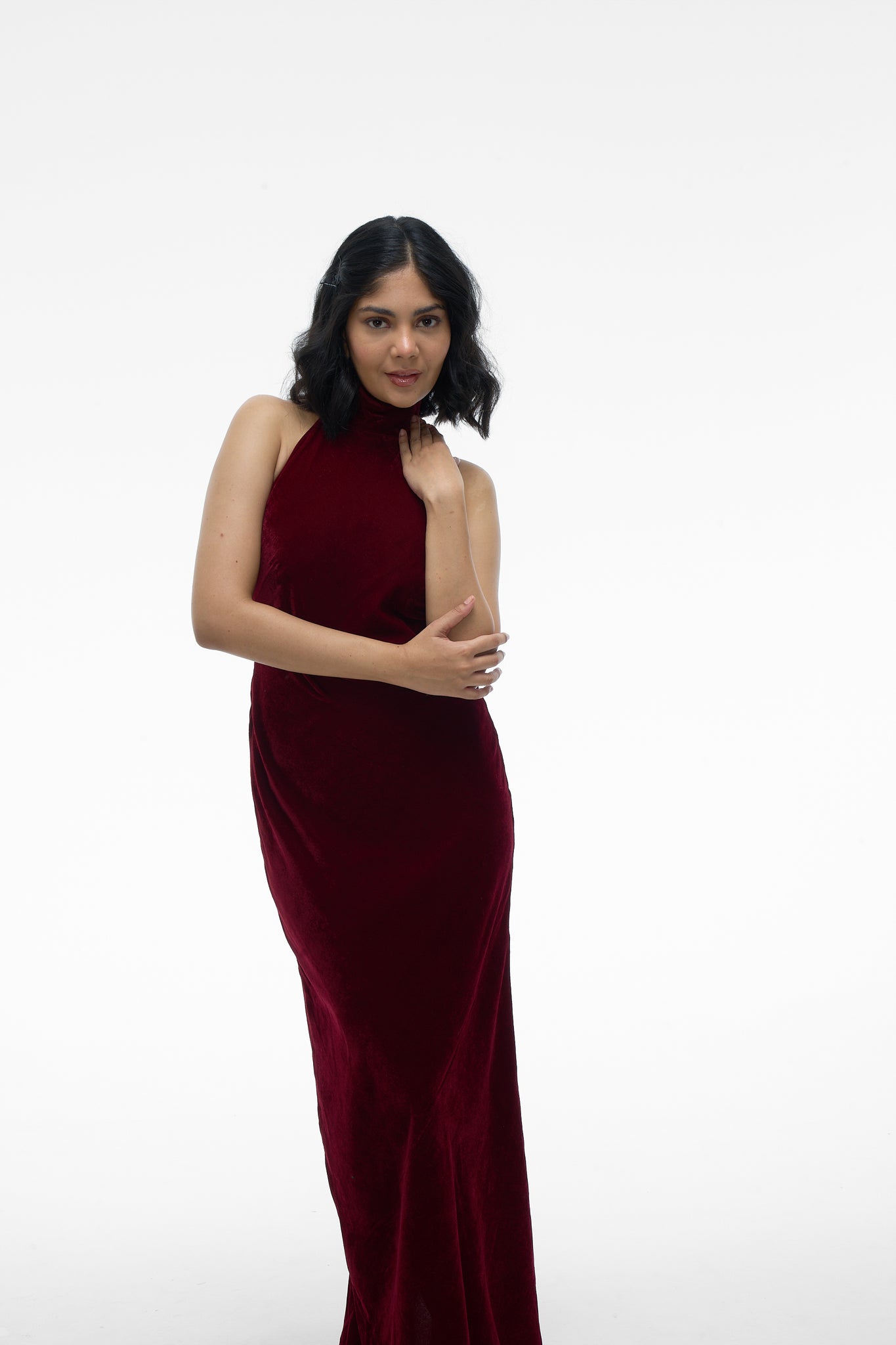 Details: Crafted from luxurious velvet, this gown features an elegant high halter neck that secures with long sashes, revealing a dramatic open back. The column silhouette gracefully skims the body and flows to the floor.