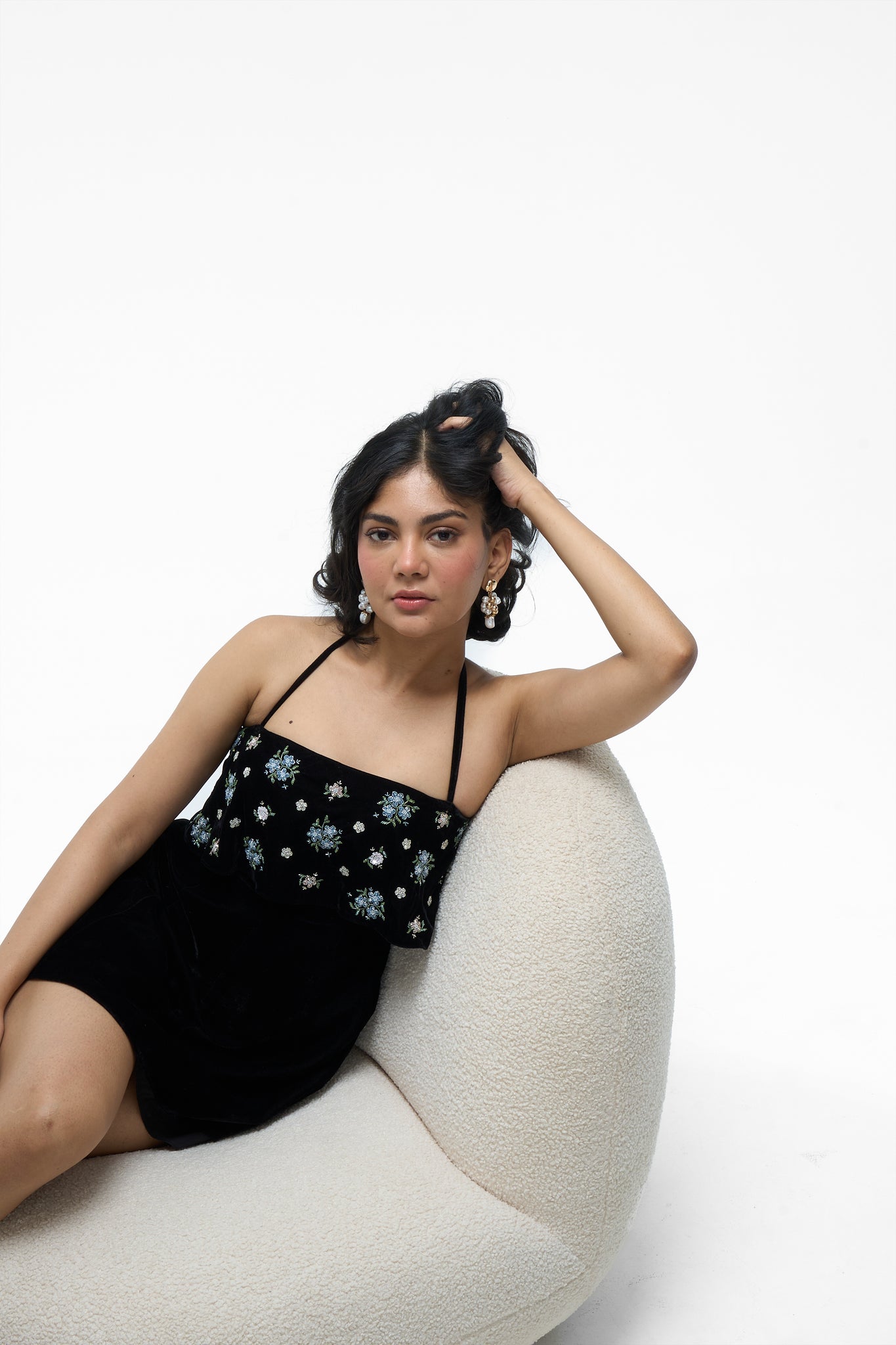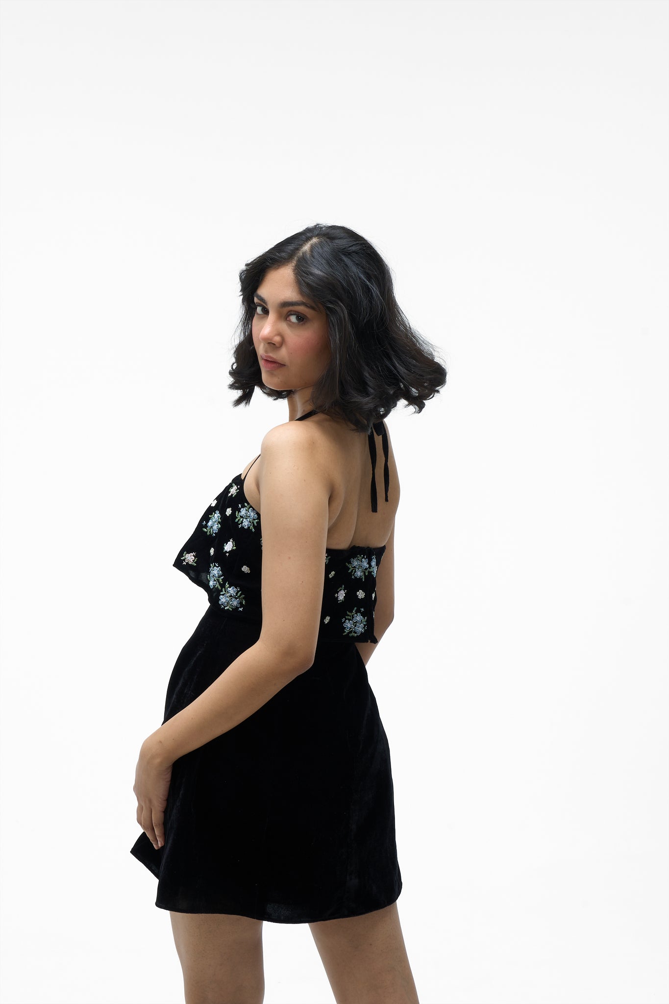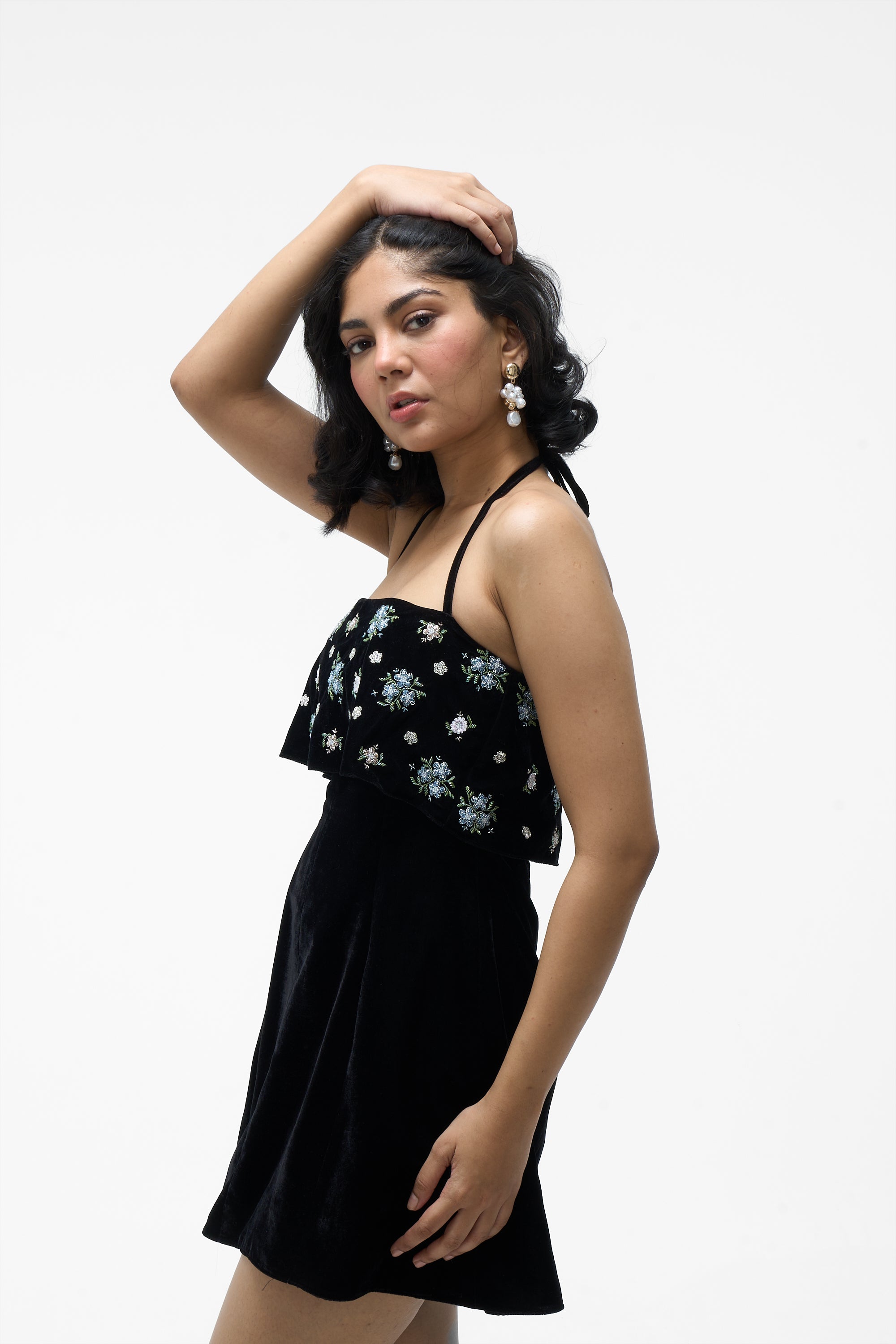 Style: Embroidered Velvet Halter Flounce Mini Dress