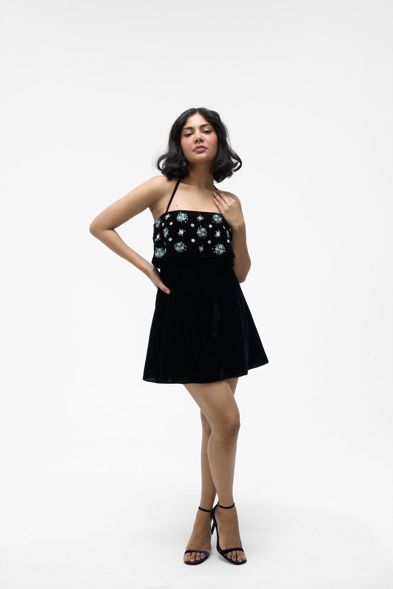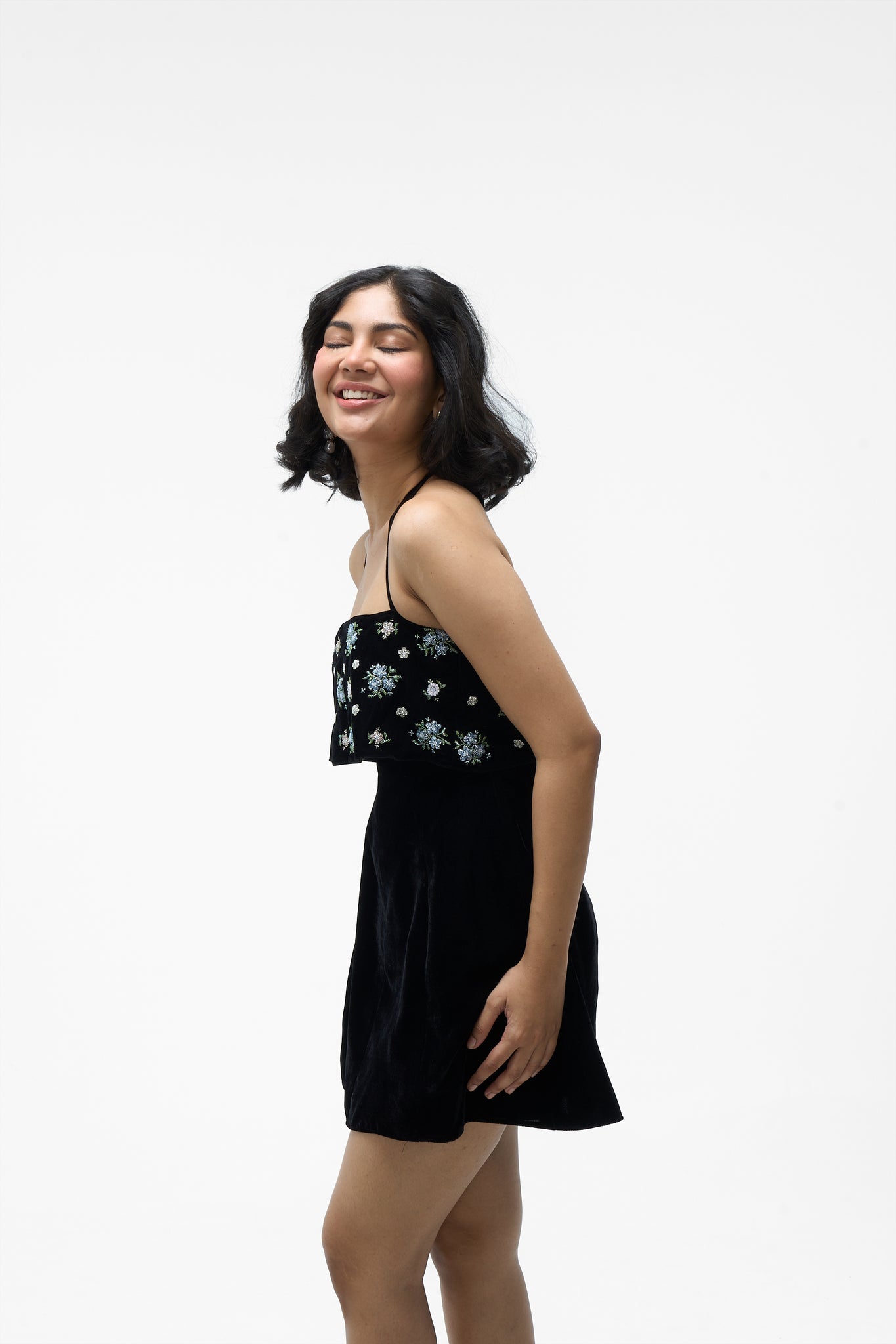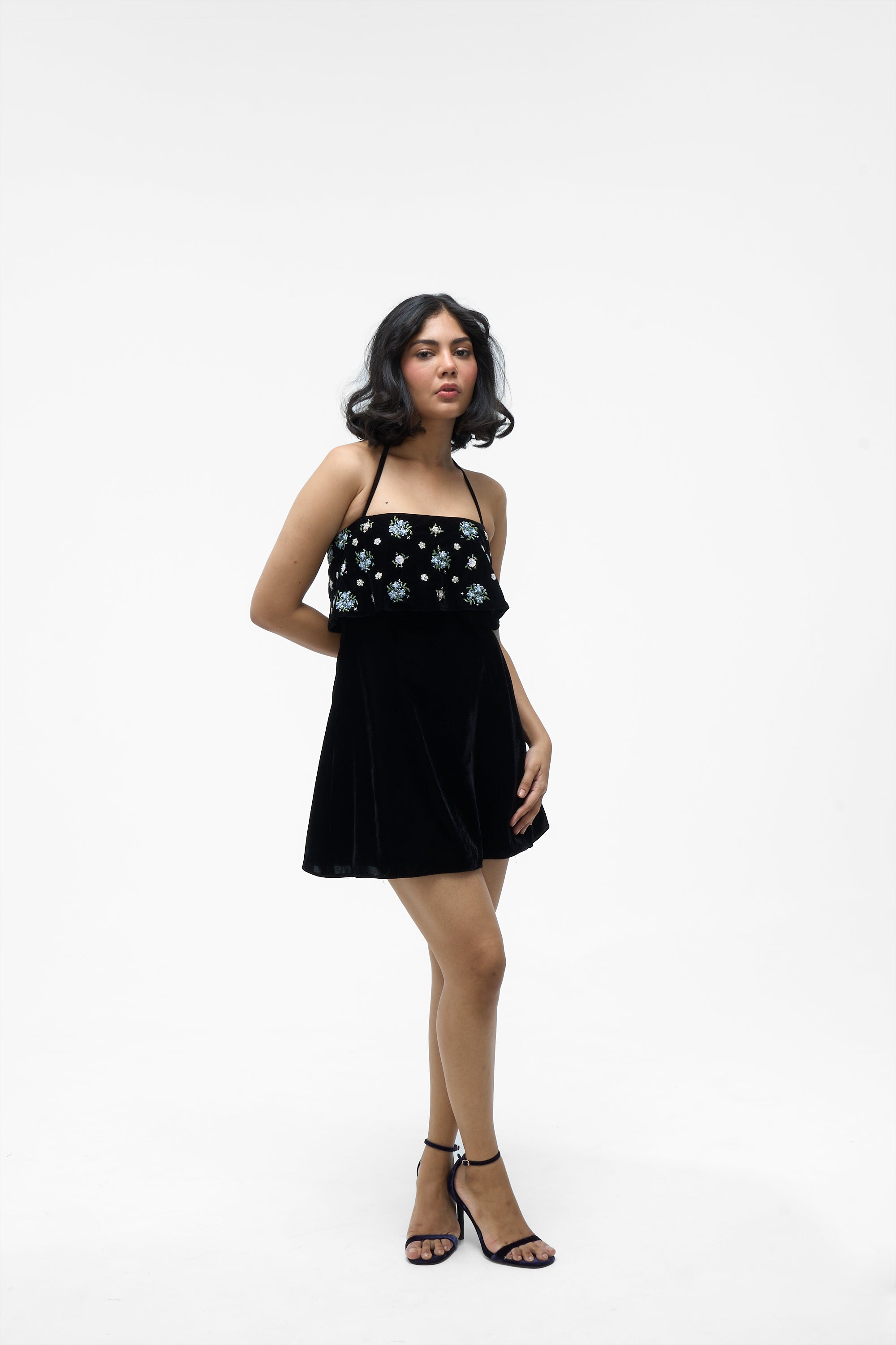 Style: Embroidered Velvet Halter Flounce Mini Dress
