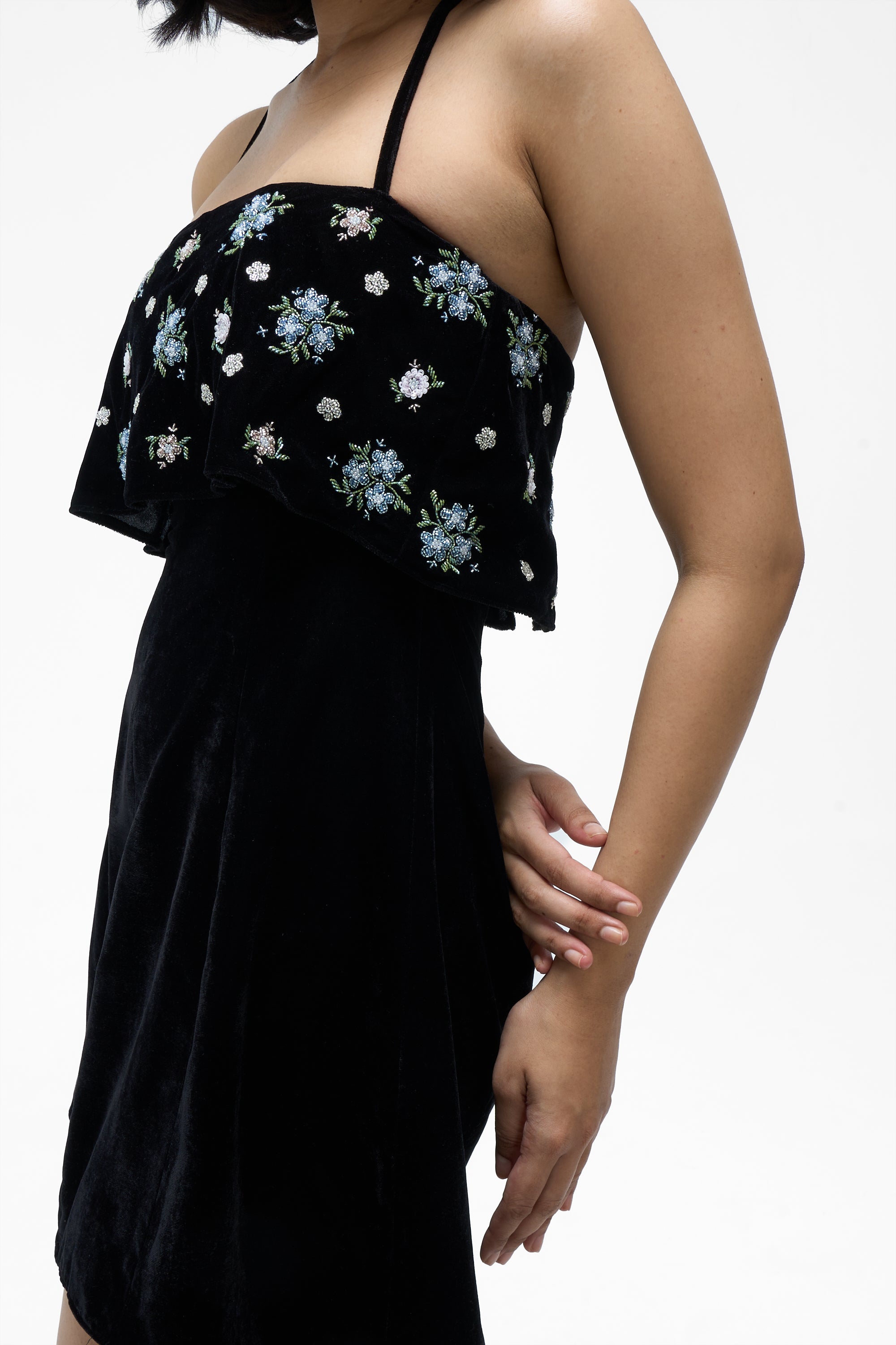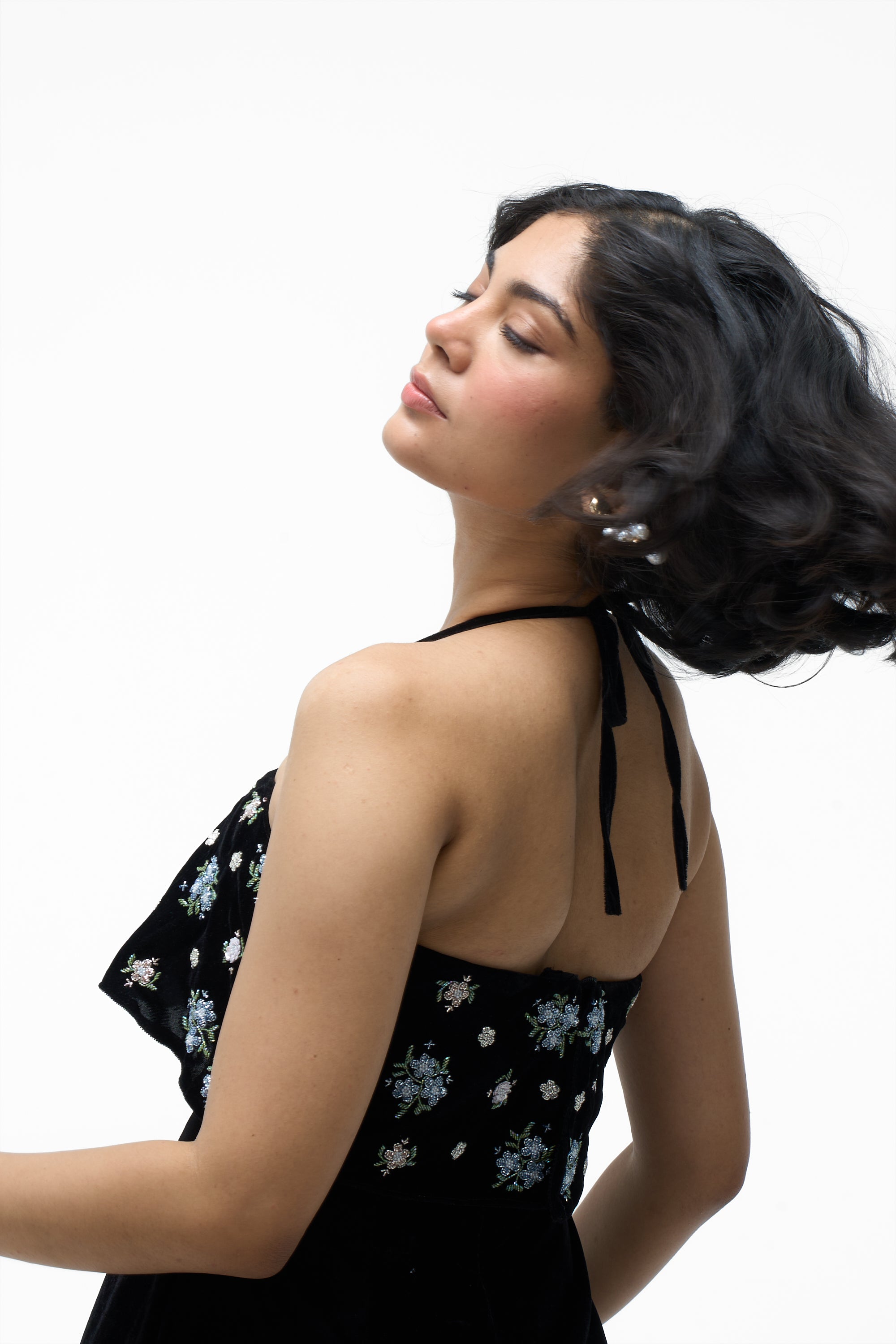 Details: Luxurious velvet dress featuring a wide, embroidered flounce overlay on the bodice; adjustable halter neck tie-up closure; open back design.