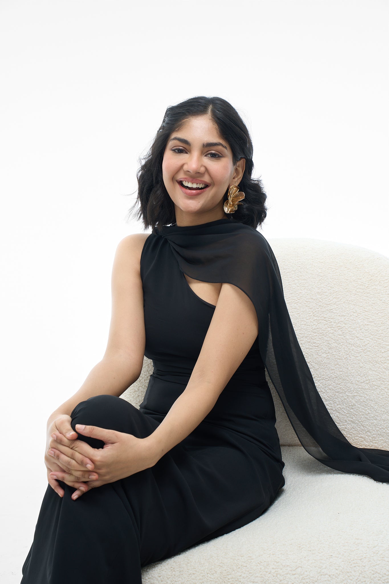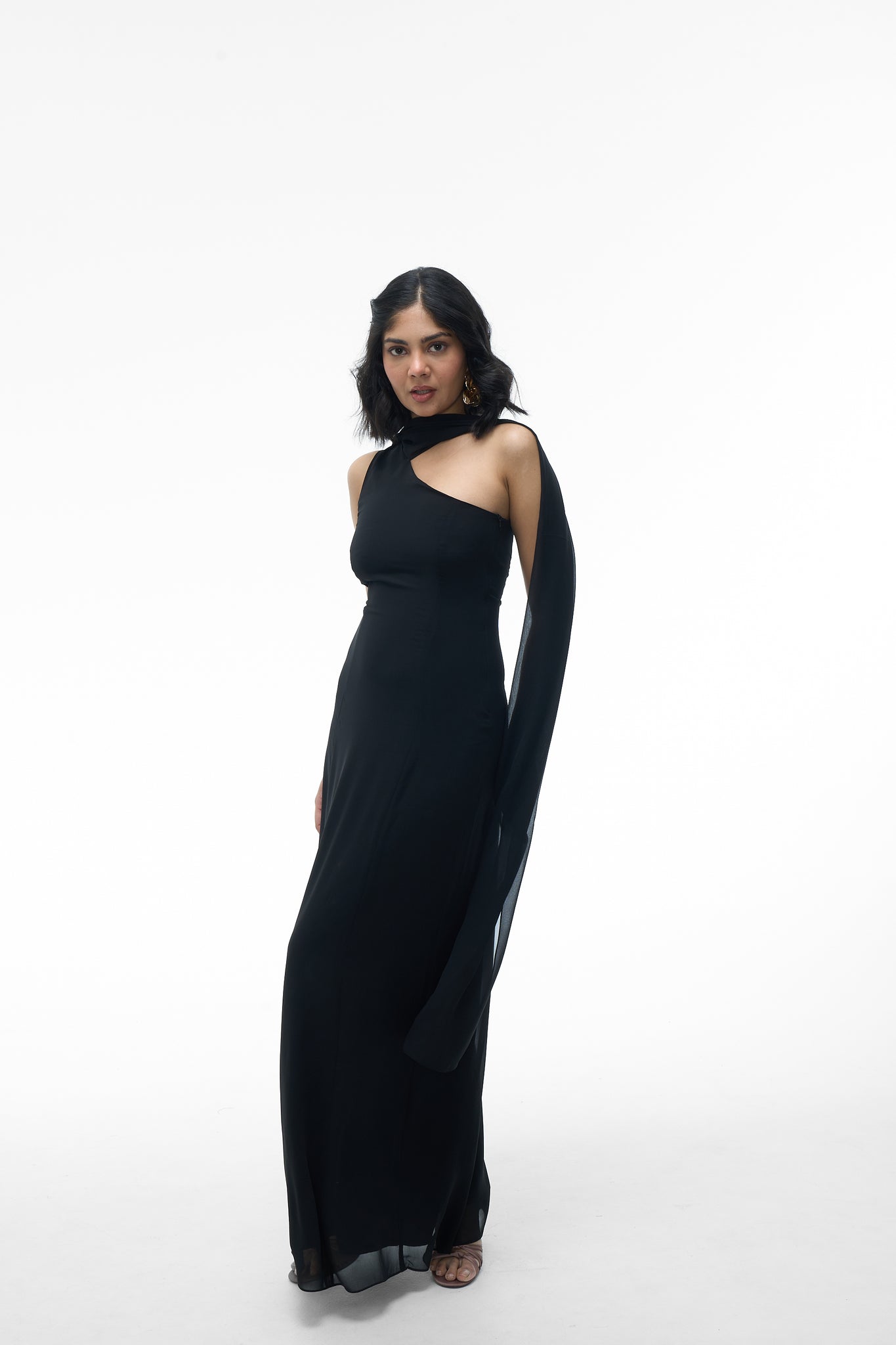 - Details: Long, flowing sash attached at the shoulder; open back design; concealed zipper
