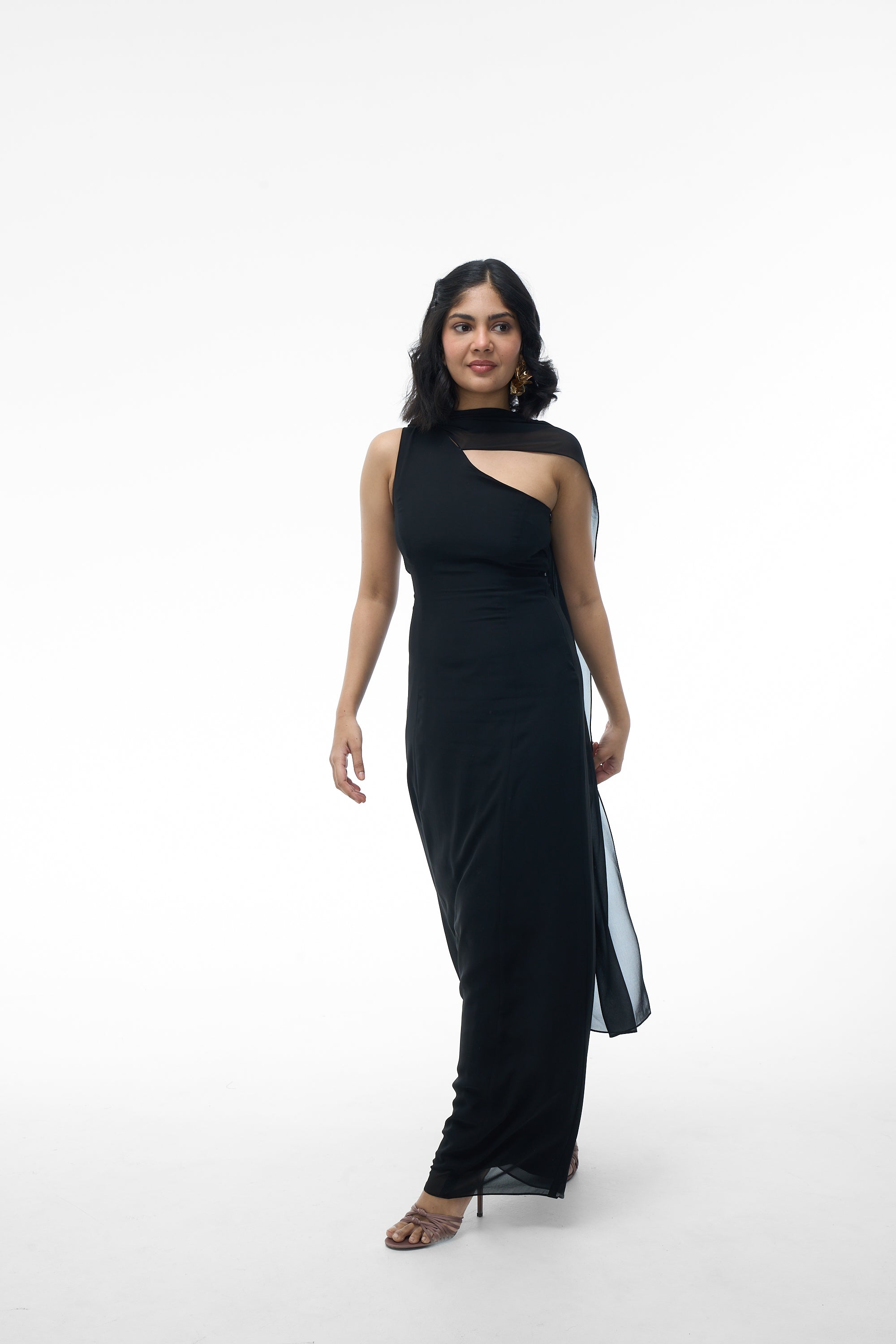 - Neckline: High-neck/one-shoulder design