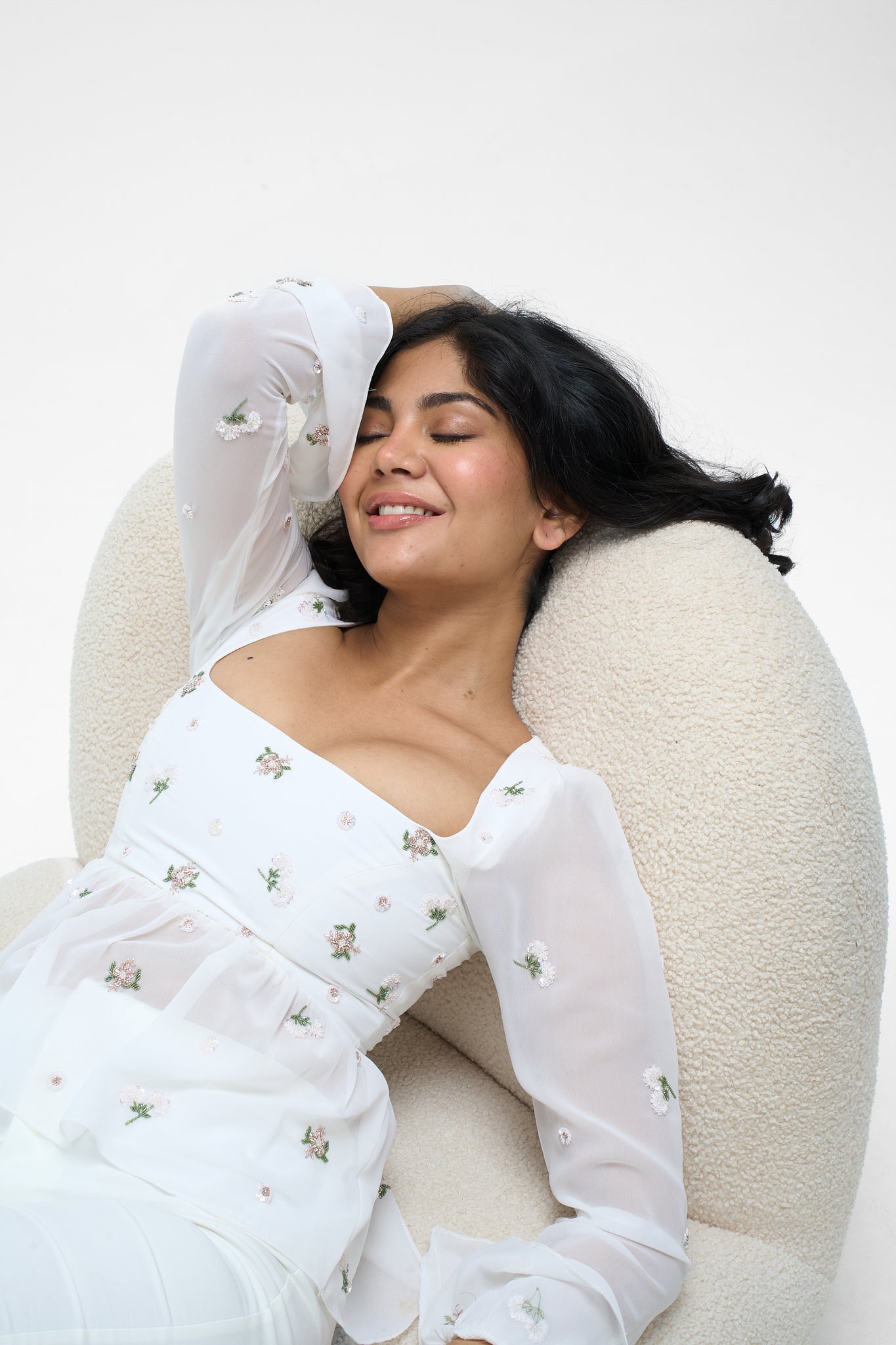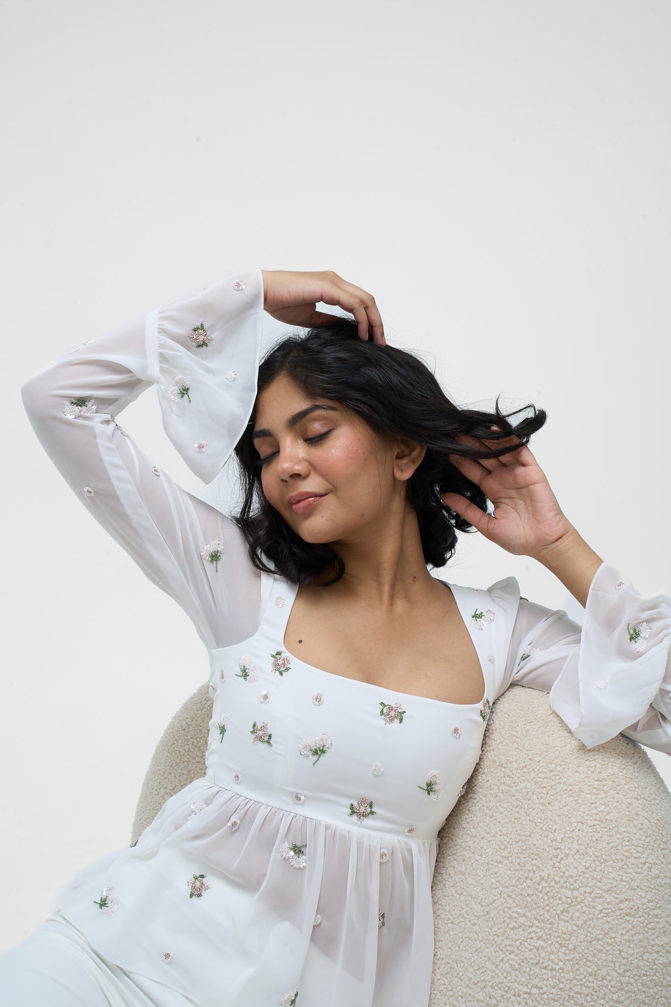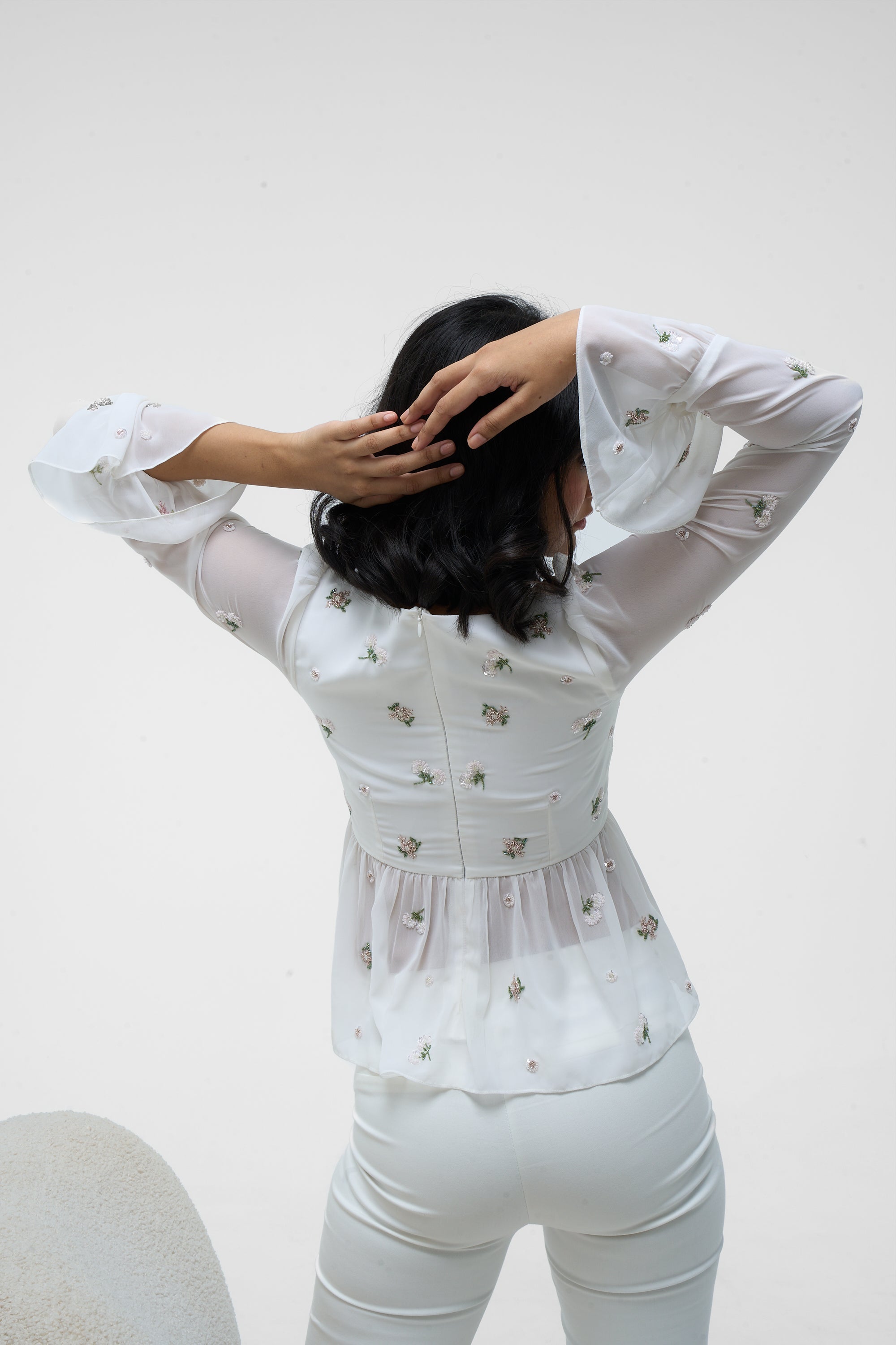 Details: An ethereal design featuring an opaque bodice with sheer sleeves and a peplum overlay. The top is adorned with delicate, hand-embroidered floral sprigs. Concealed center-back zipper.