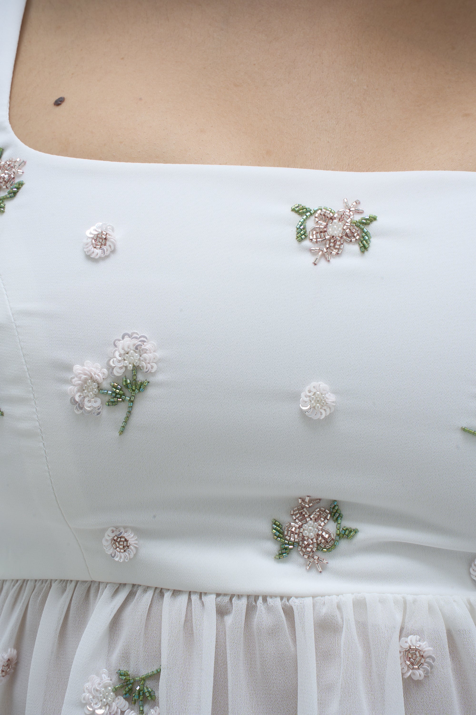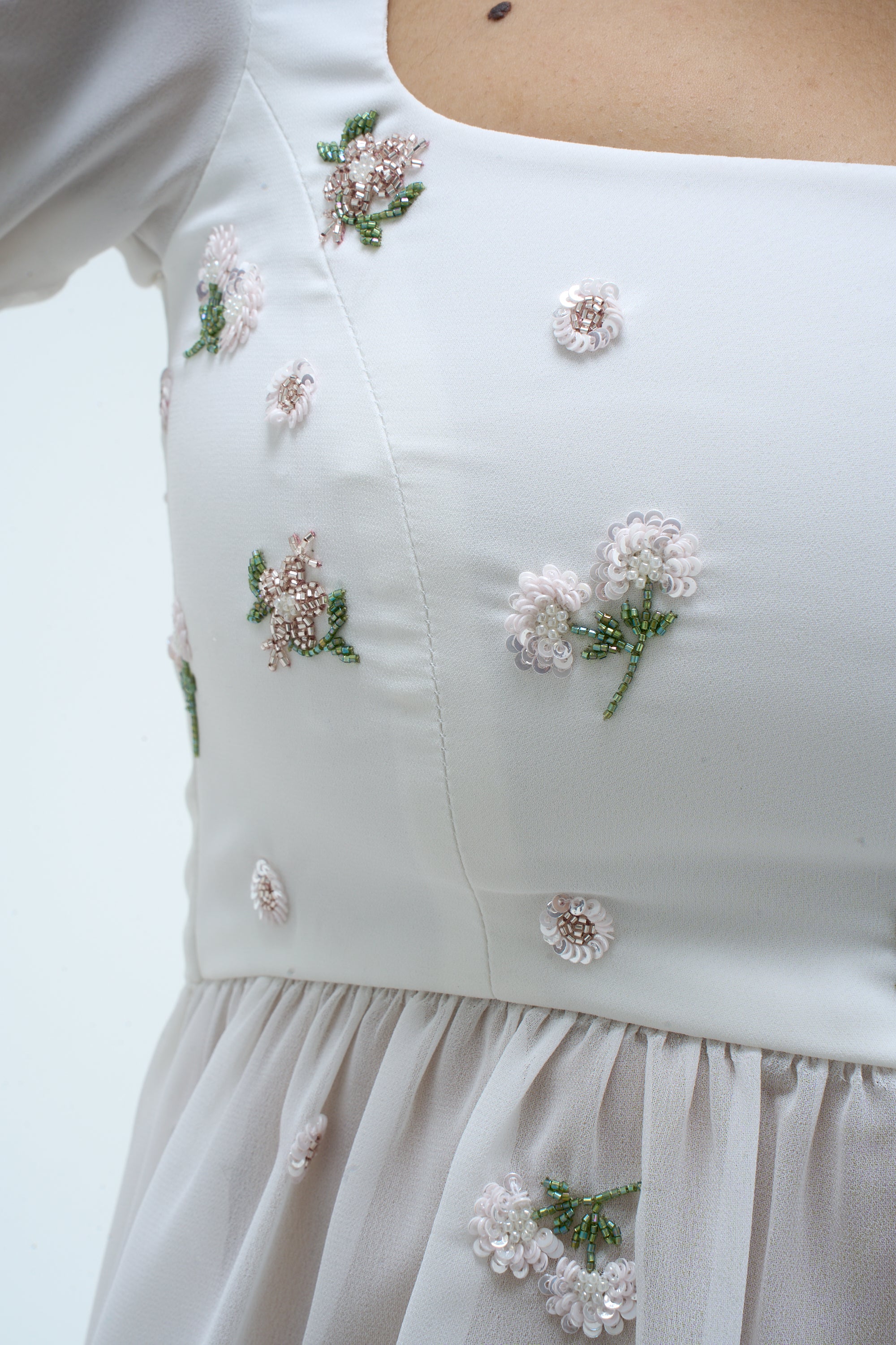 Beadwork: Hand-embroidered with pink and white sequins and seed beads, forming scattered delicate floral motifs.