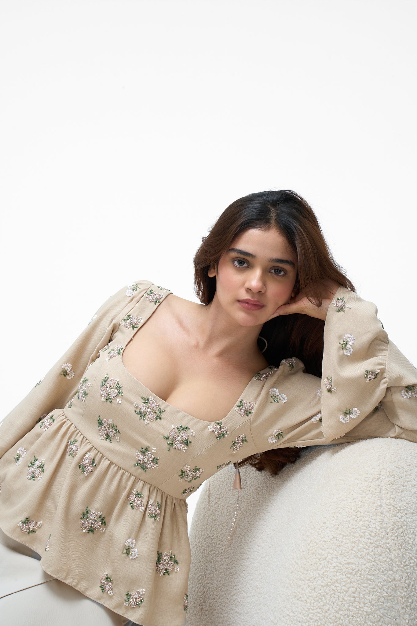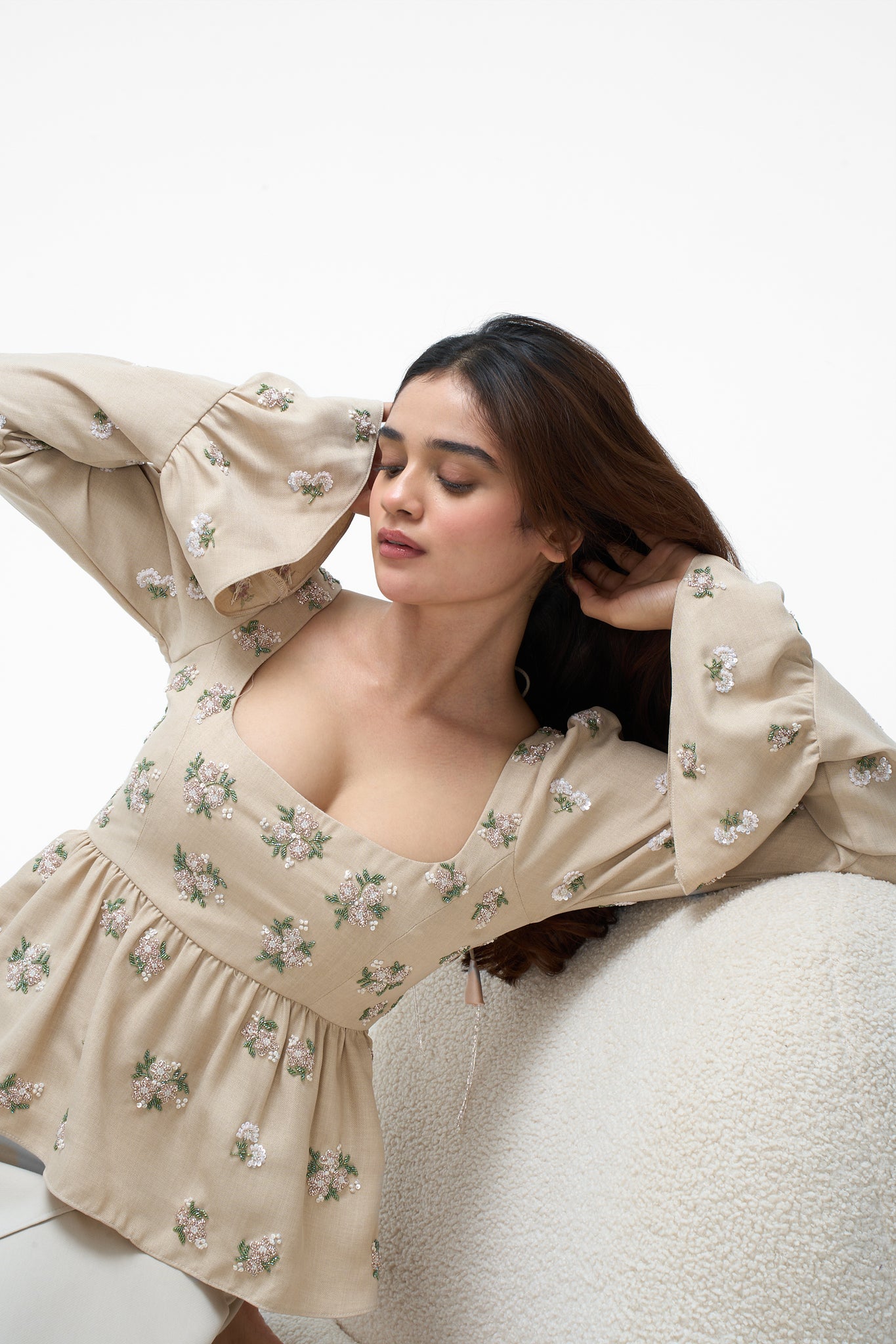 • Style: Floral Embroidered Bell-Sleeve Peplum Top