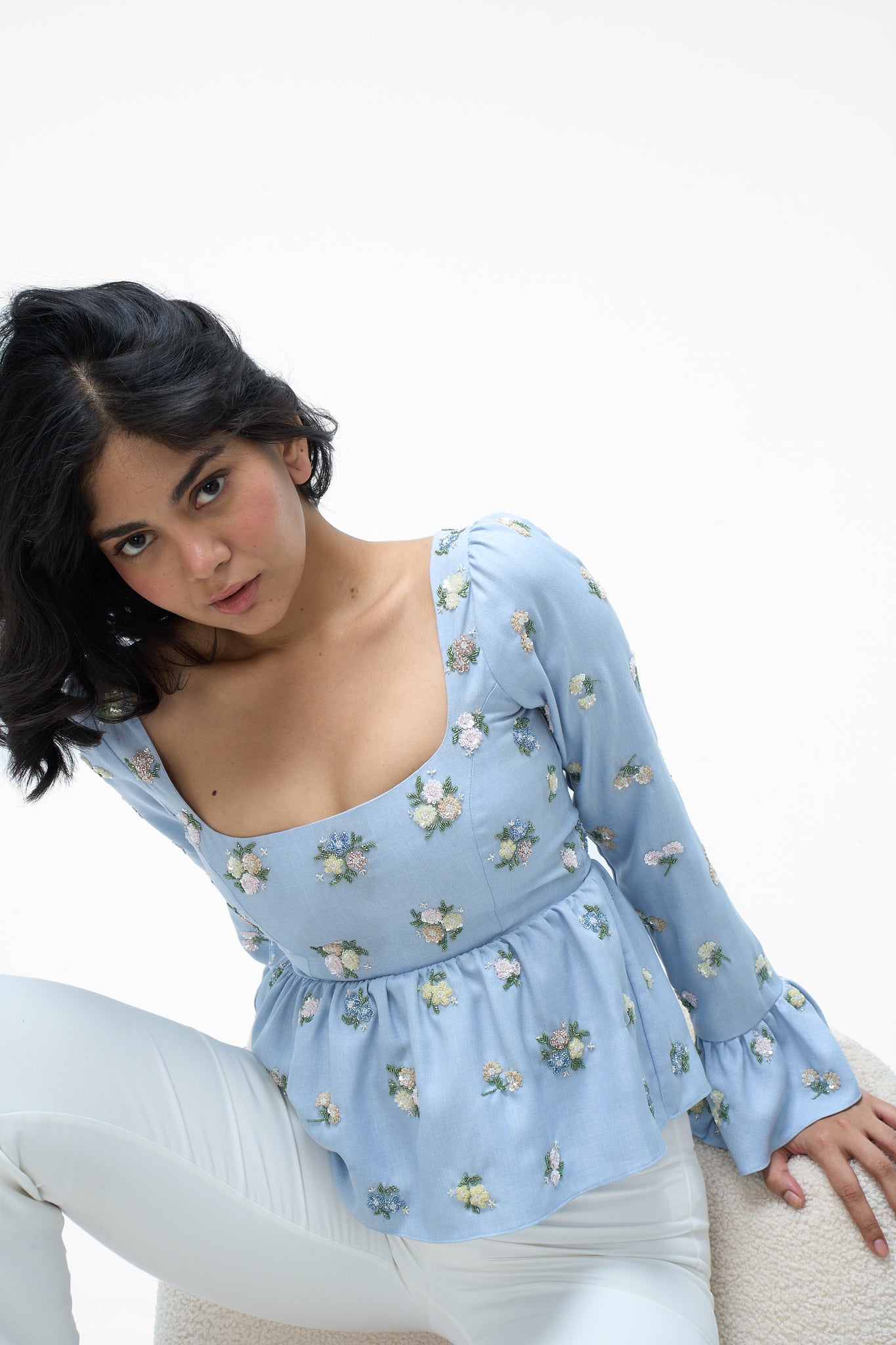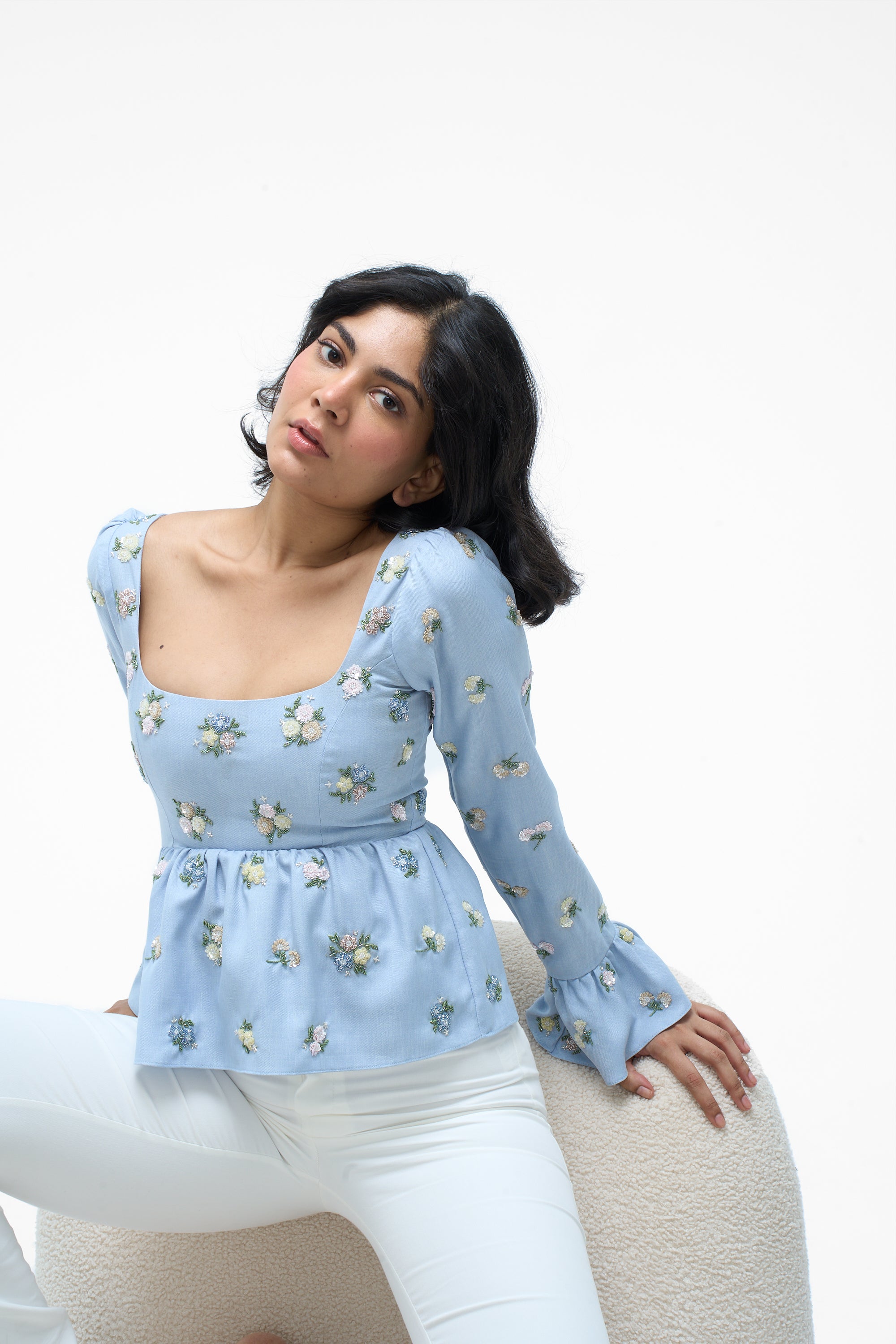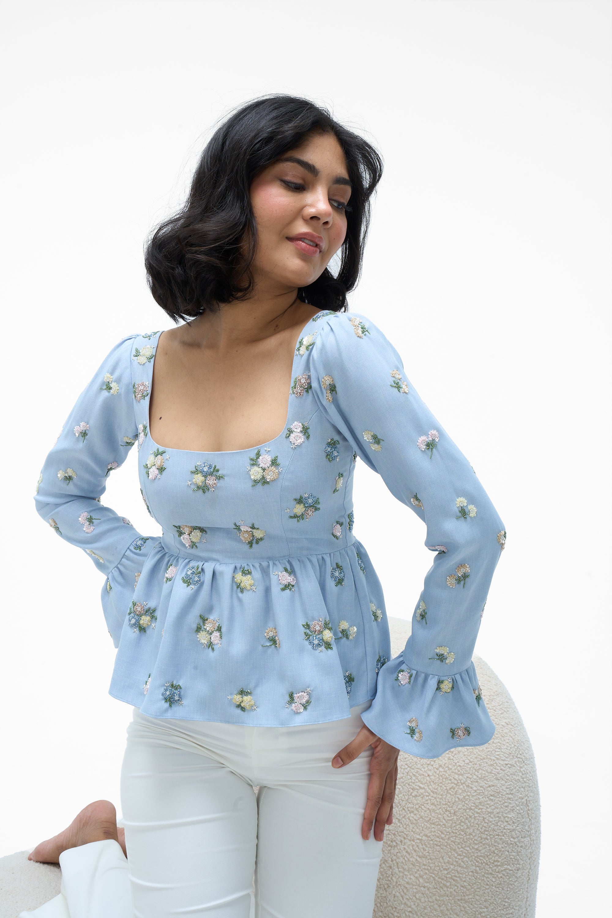 Style: Floral Embroidered Bell-Sleeve Peplum Top