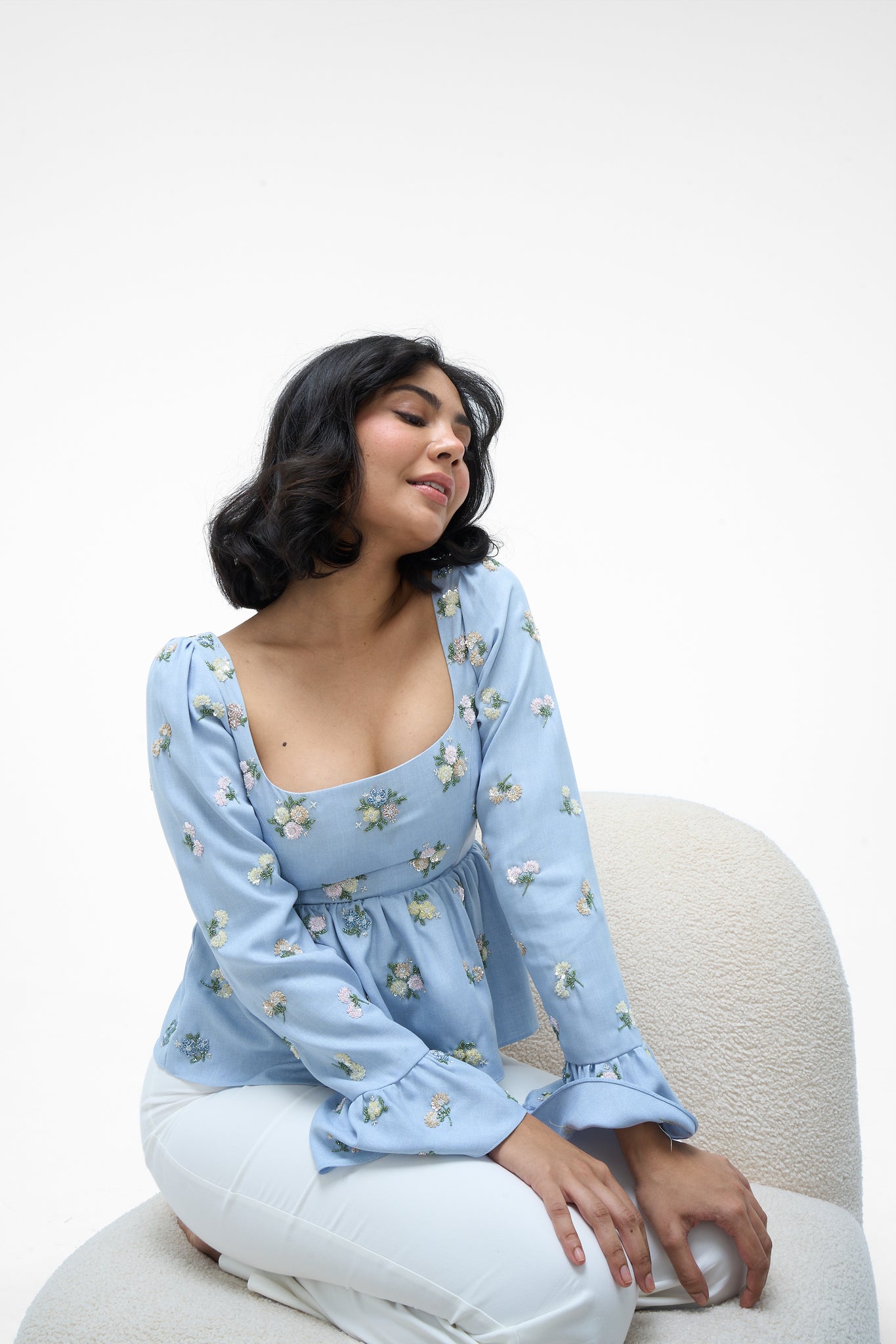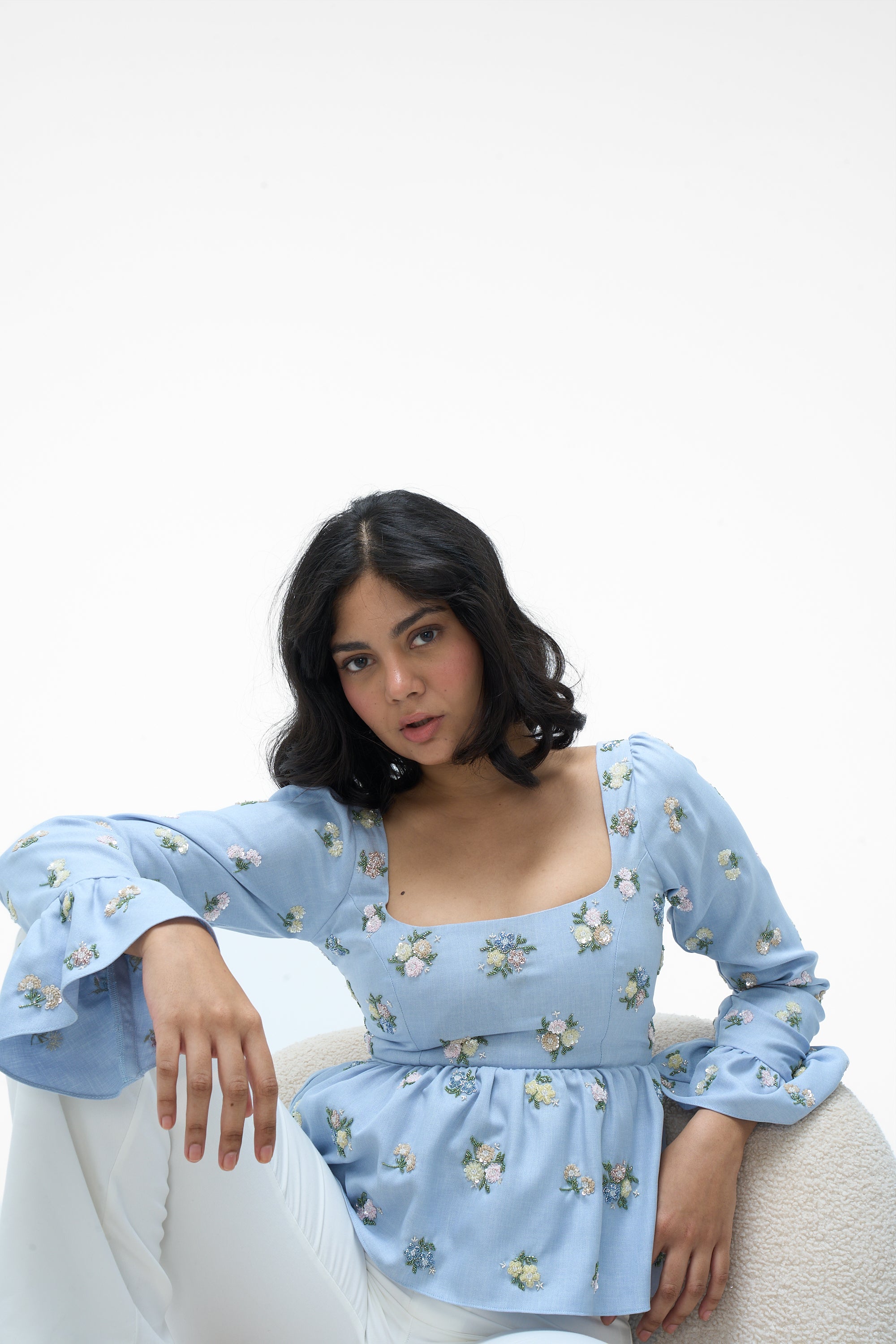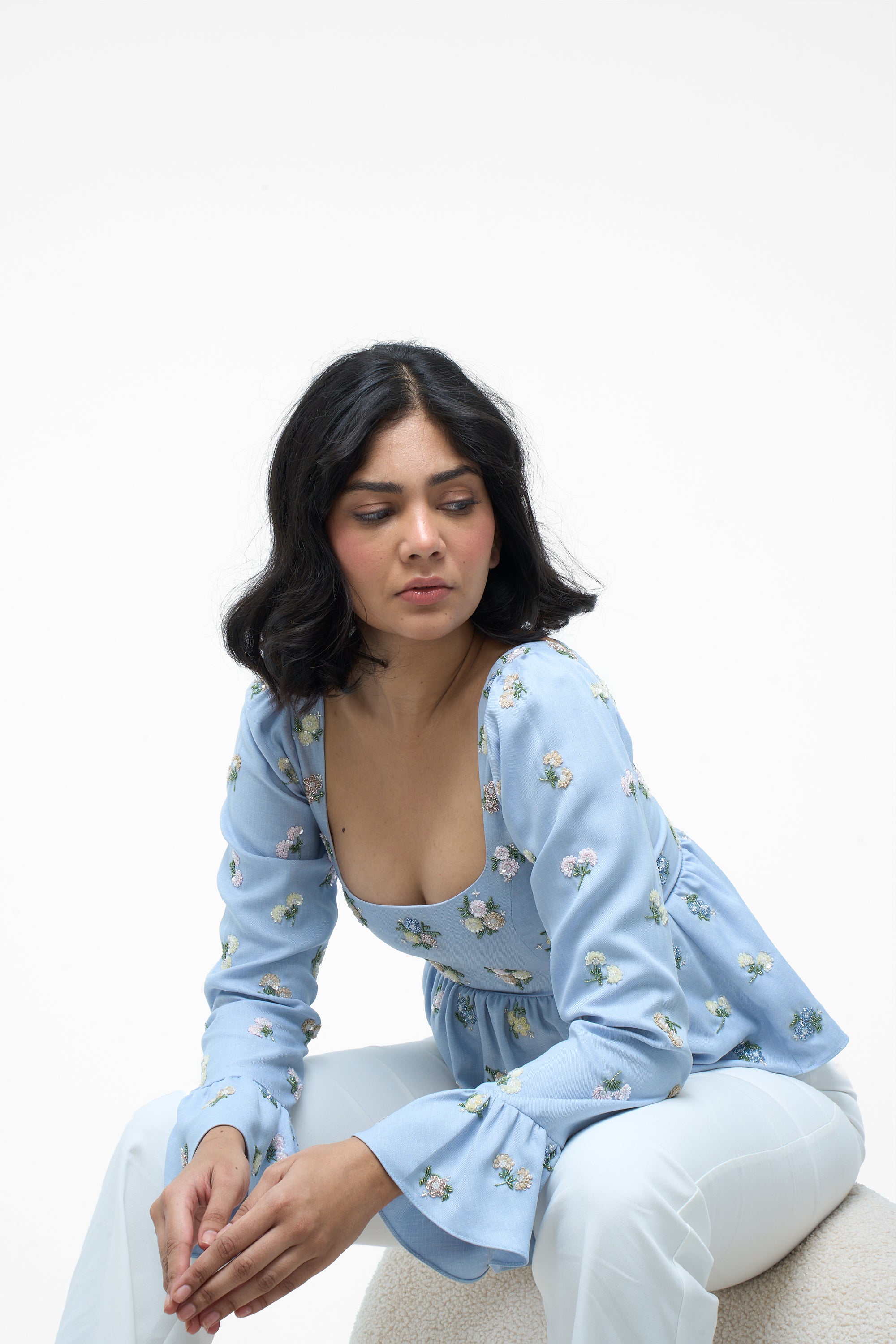 Style: Floral Embroidered Bell-Sleeve Peplum Top