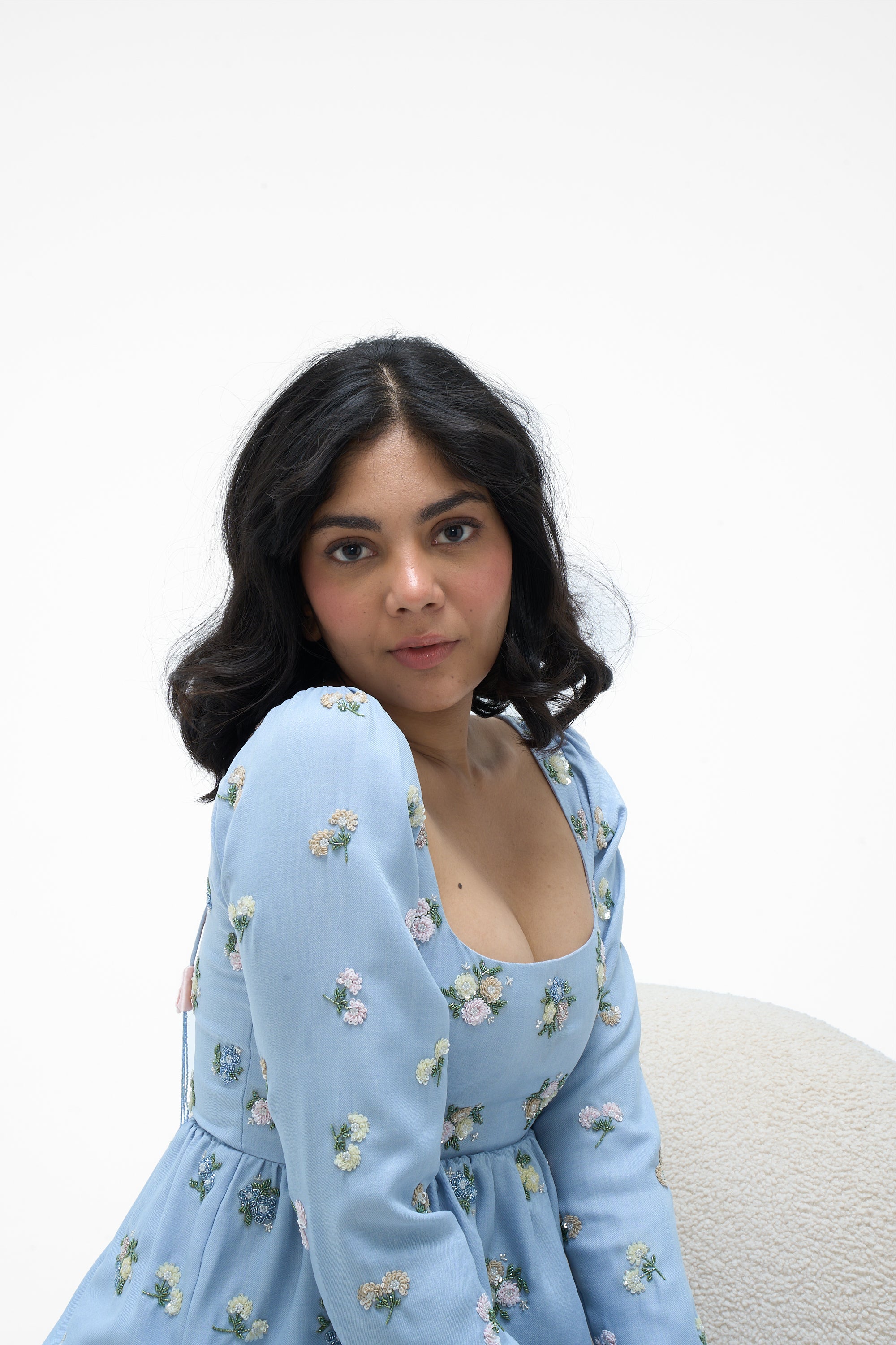 Details: Features all-over delicate floral embroidery, a flattering square neckline, and statement bell sleeves. Concealed back zipper for a seamless fit.