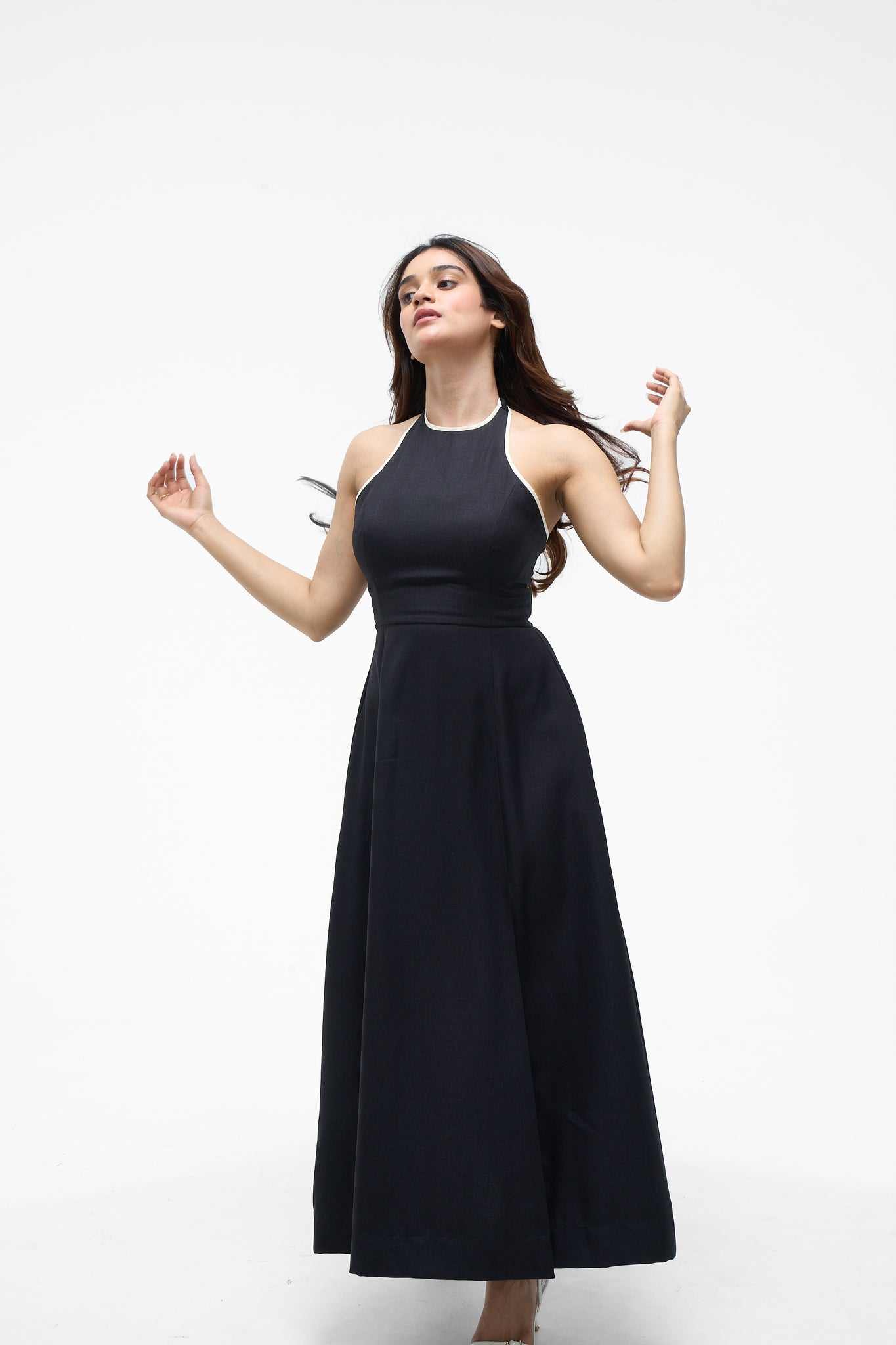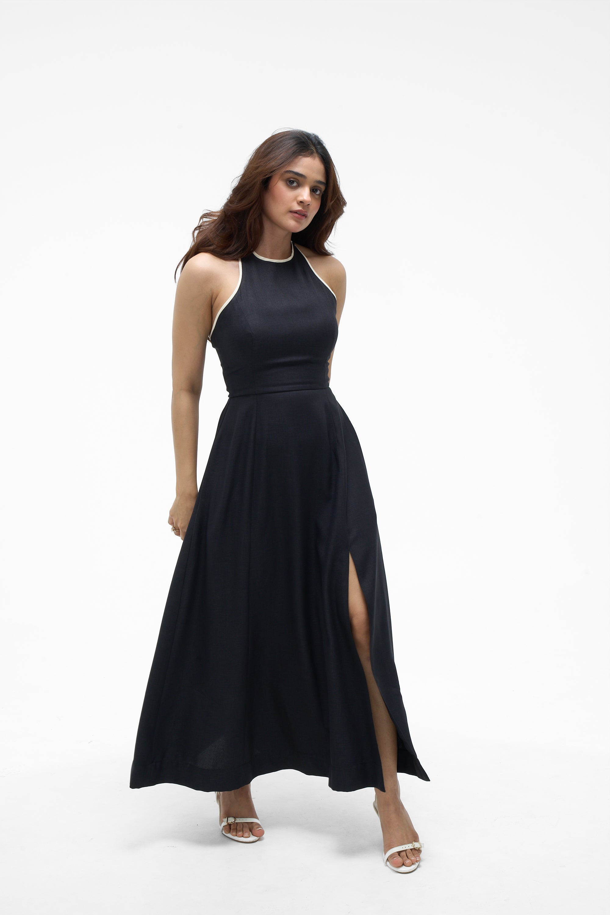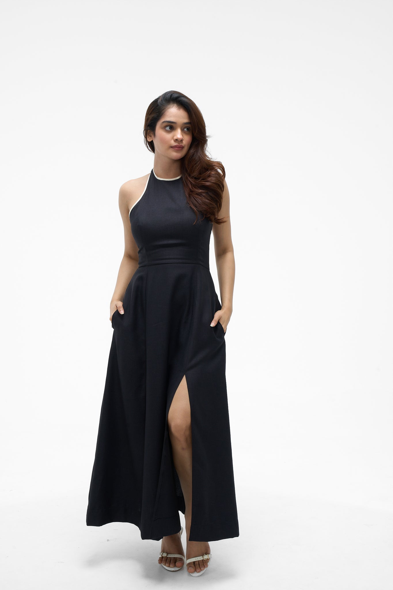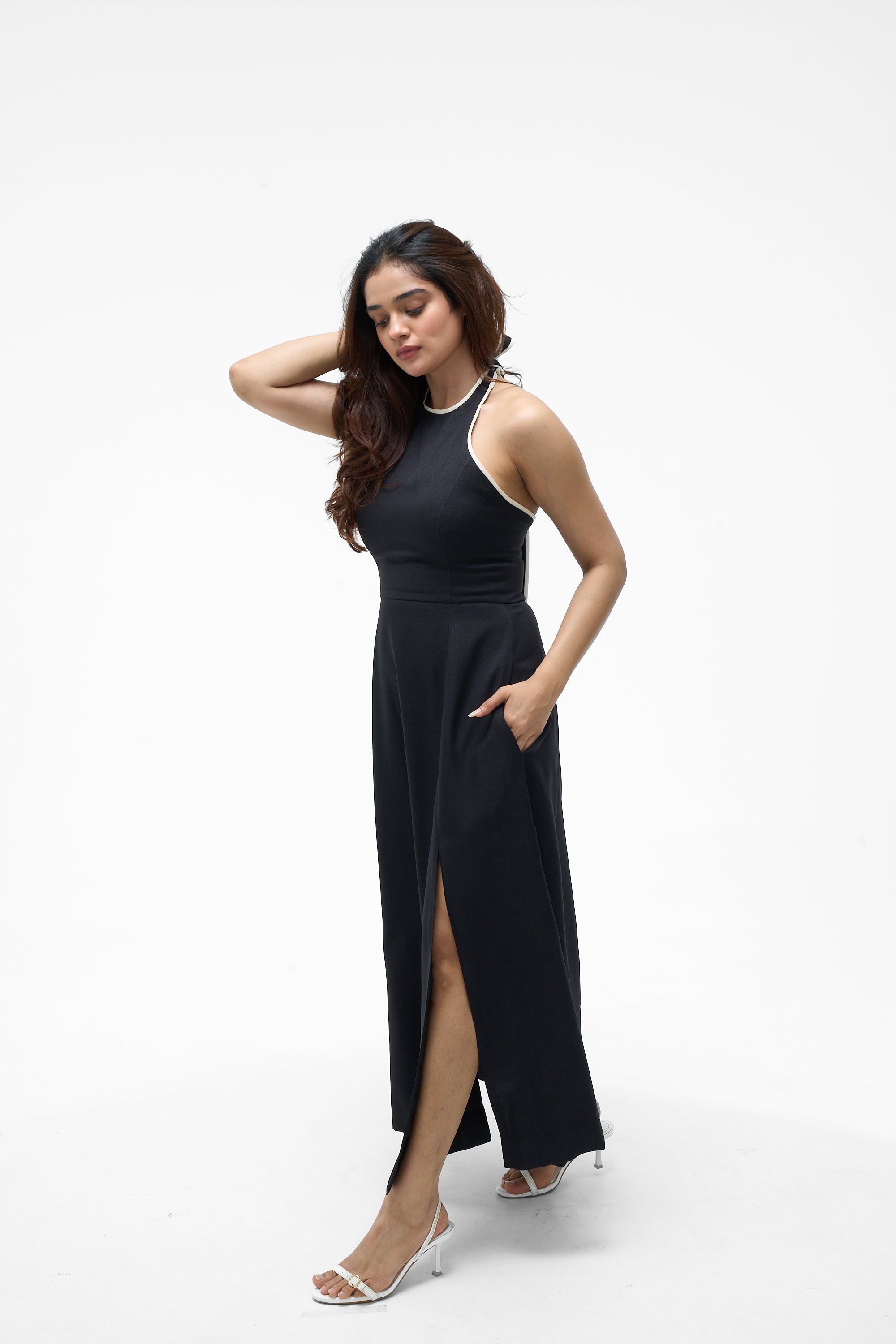 Details: Elegant contrast off-white piping along the neckline and armholes; functional side-seam pockets; open back with a tie-up closure; comfortable smocked back panel.