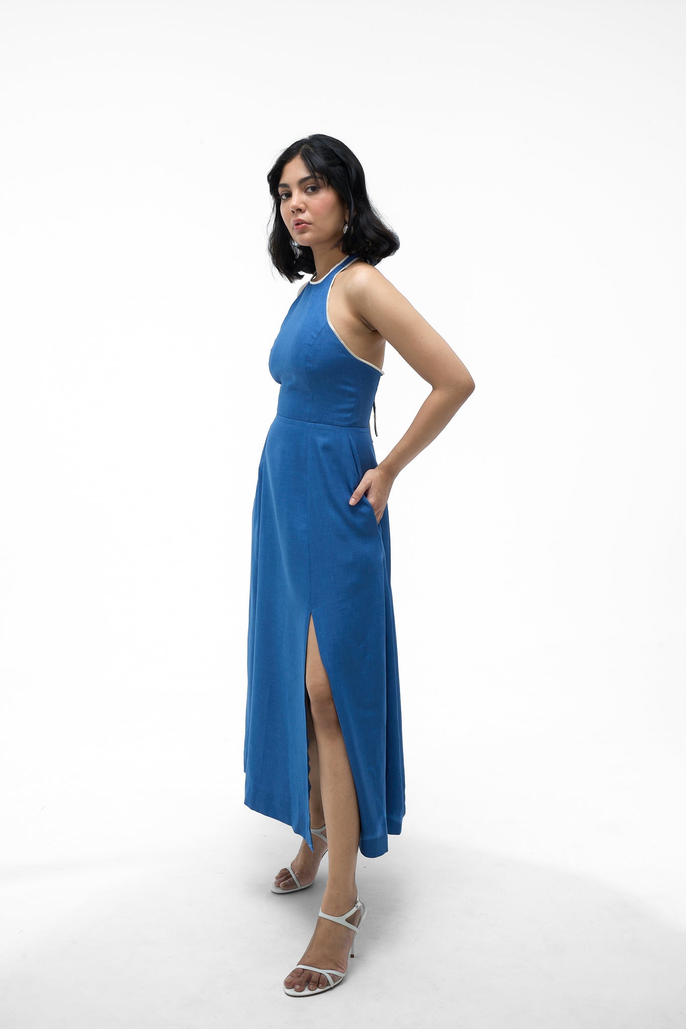Details: Elegant contrast off-white piping along the neckline and armholes; functional side-seam pockets; open back with a tie-up closure; comfortable smocked back panel.