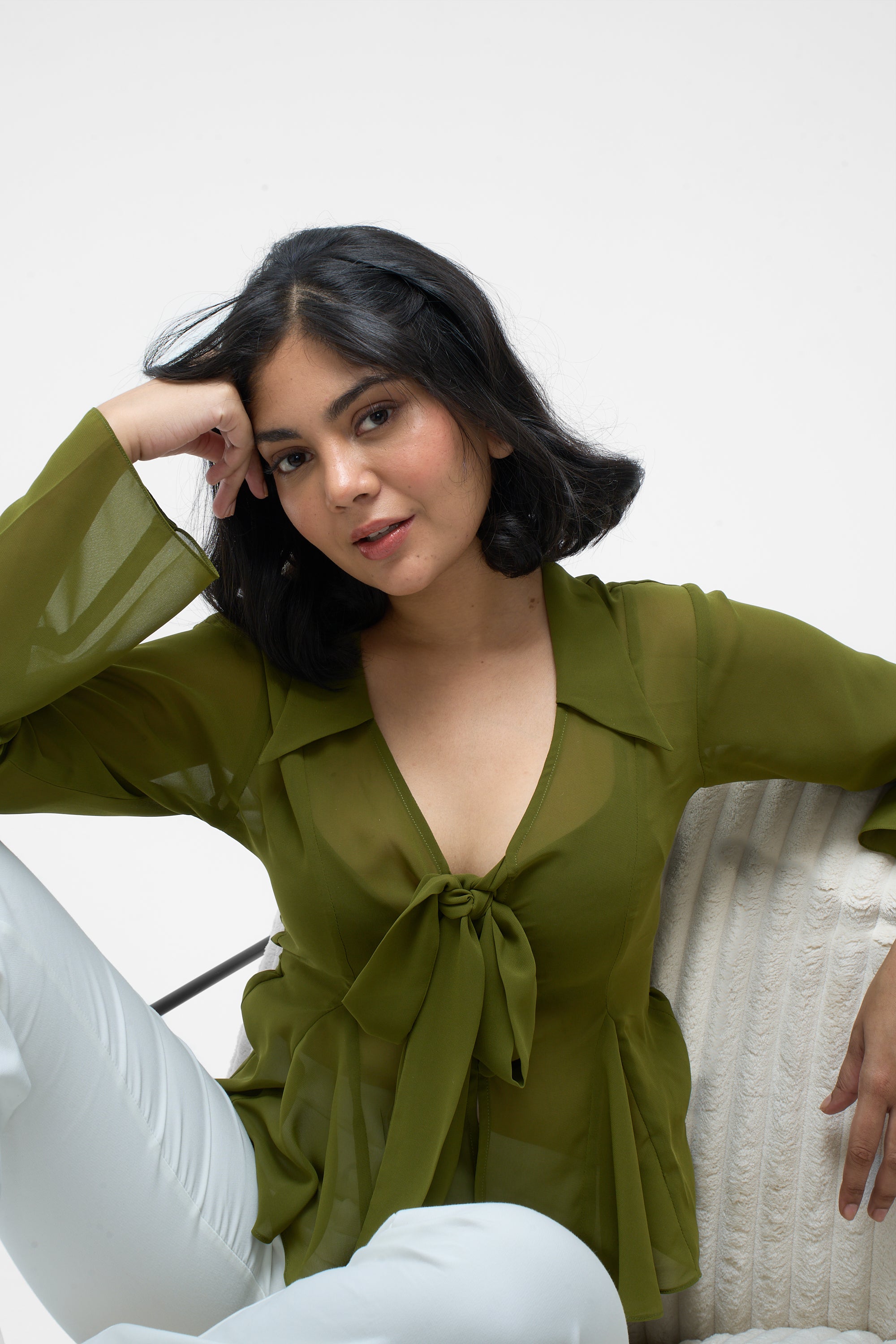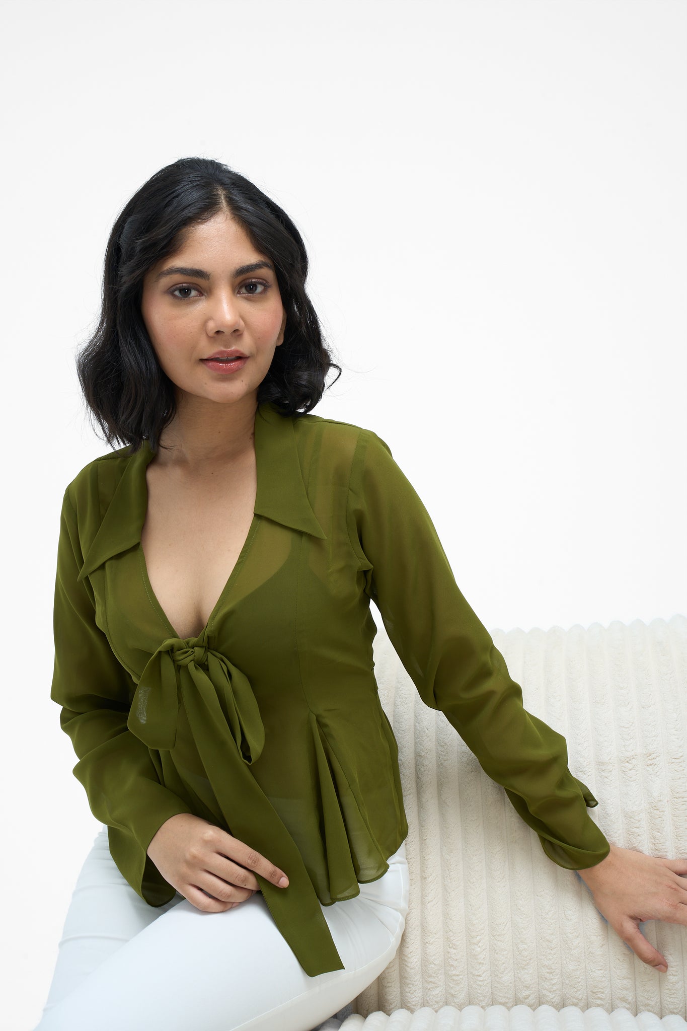 • Details: Crafted from lightweight, sheer georgette, this blouse features a classic shirt collar, a deep V-neck with a tie-front closure, and a partial button placket for a secure fit.